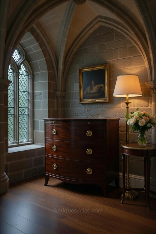 We are offering for your home this Stunning Small Bowfronted Chest with a Brushing Slide. Three Long Drawers with Oak Linings. Splayed feet to the front and sides sat just below a simple beaded moulding. The top has a Boxwood stringing inlaid and is crossbanded to add to the overall quality of this period chest. Deep rich colour and patination throughout this great example. Later quality lions mask handles very much in the keeping of the Regency Period. Dimensions are 35 inches wide. 22 1/4 inches deep and 35 inches tall. Delivery within the uk is included in the price and we are more than happy to quote for shipping to any part of the World. We welcome all inquires on this item or any other that we may have in stock. Thanks for looking Chris 07778655965.DateRegency