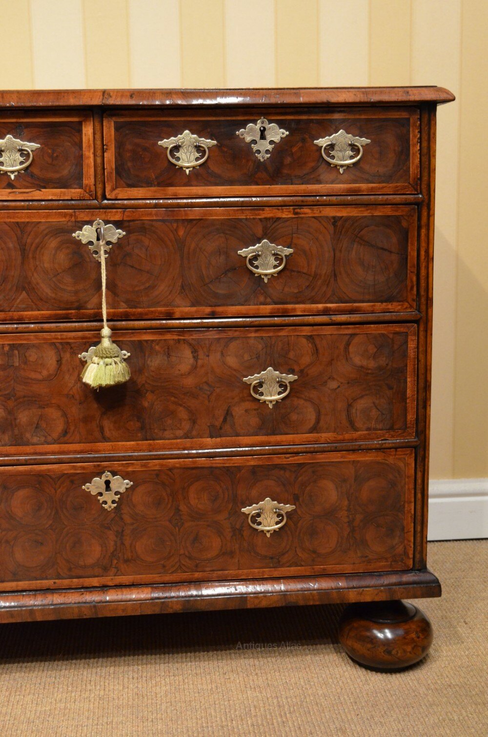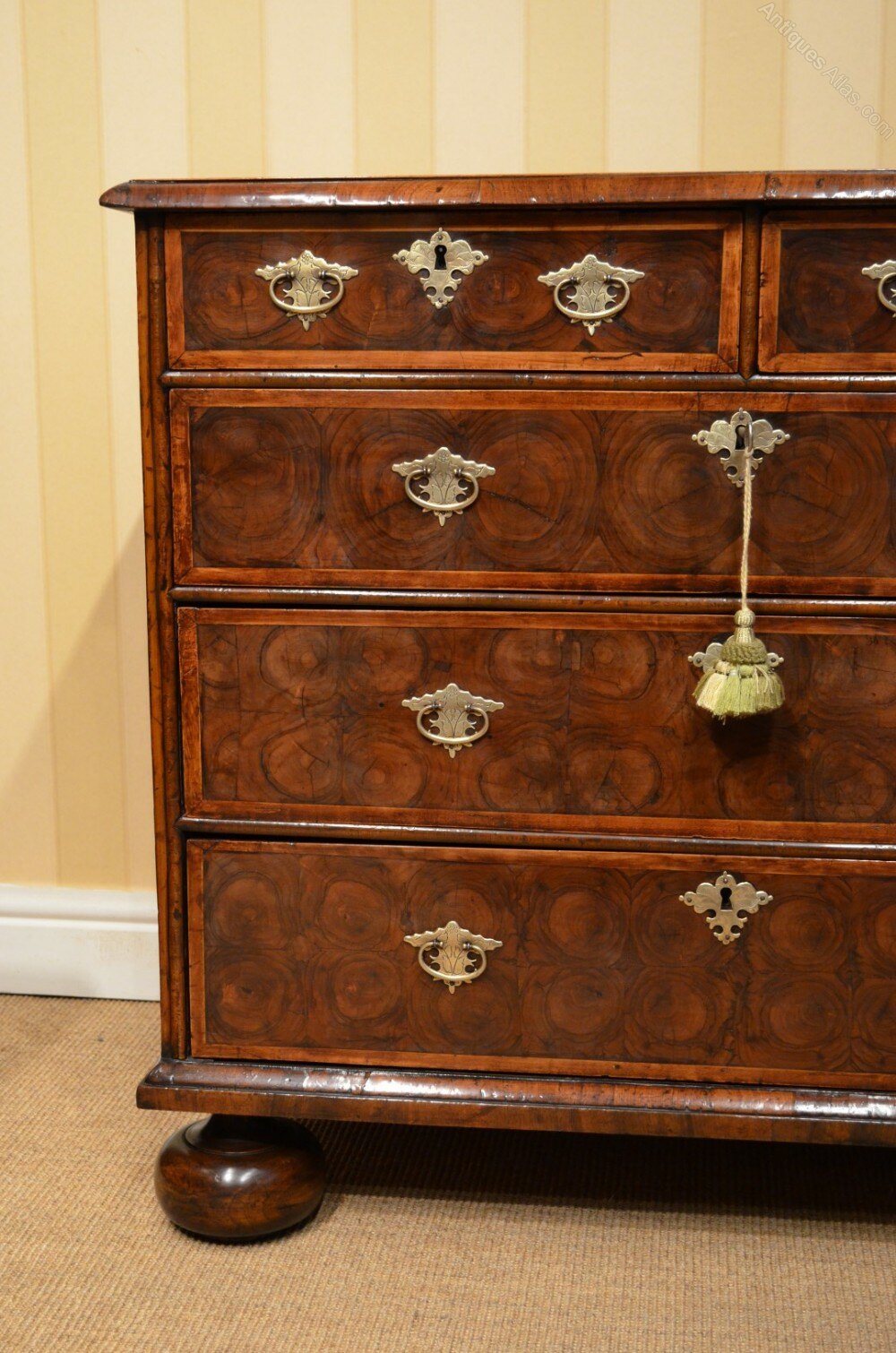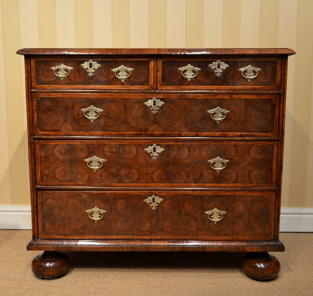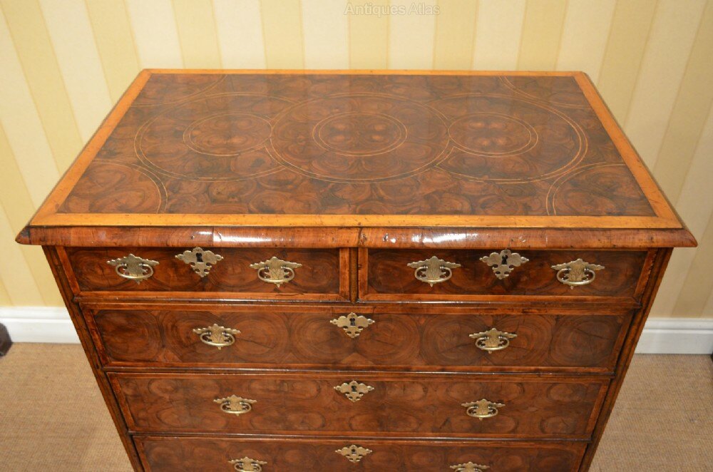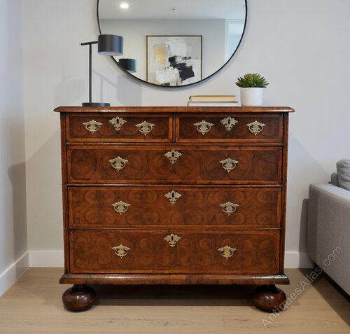 We are offering for your home this most Stunning Oyster Veneered and Walnut Chest of Drawers. Two over Three Drawers that are Banded. Geometric Patterned Top and Banded. Walnut Veneered sides with banding decoration. Cross grained mouldings throughout Sat on Later Bun feet very much of the Late 17th Century Period. Later Quality Brass Handles and a working key. Dimensions are 37.5 inches wides 22.25 inches deep and 33.5 inches tall. Beautiful Colour and Patination Throughout this great great example.More images available upon request. Delivery within the Uk is in included in the asking price. Shipping is also a pleasure so please do inquire for a quote. Thanks for looking Chris 07778655965DateLate 17th Century