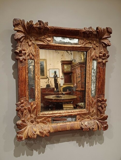 Small antique French Regence period mirror. Circa 1715-23. With carved, convex gilt wood frame which incorporates carved flowers and leaves at each corner. The frame borders are also inset with sections of original untouched mercury glass. This mirror is in a remarkable state of preservation, unaltered with a rich history of honest patination and surface history. Dimensions are 14 inches wide. 15.5 inches tall and 23/4 inches deep.More images available too. It is a Great example and Delivery within the Uk is included in the asking Price. Shipping is also a pleasure so please do contact us for a quote. Thanks for looking and we welcome all inquiries at Christopher Tombs Ltd. Chris 07778655965DateEarly 18th Century