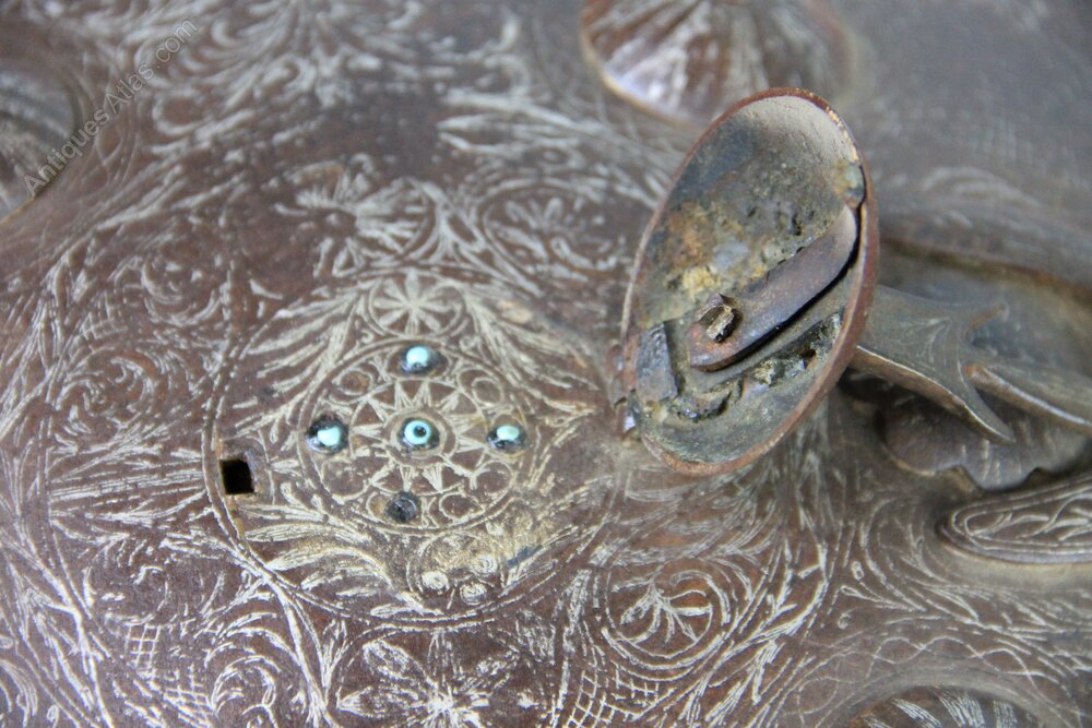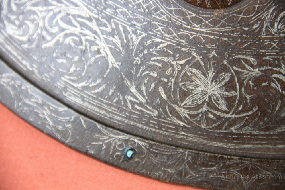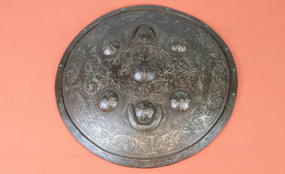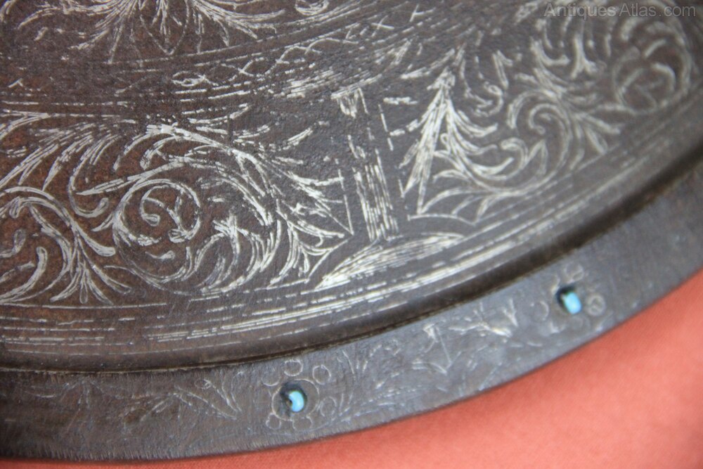 19th century Indian Steel Dhal shield. Has four central bosses and an additional opening central boss with cruciform spike. Two further bosses have crescent moon decoration. The shield is covered in silver koftgari scroll work. The edge has applied turquoise stones. There are also some turquoise stones under the hinged central boss. The back of the shield has its original knuckle pad and four iron rings for carrying straps which are missing. In generally good condition overall with age wear.Approximately 35cm in diameter and height of shield to central spike 12cm.