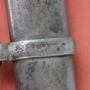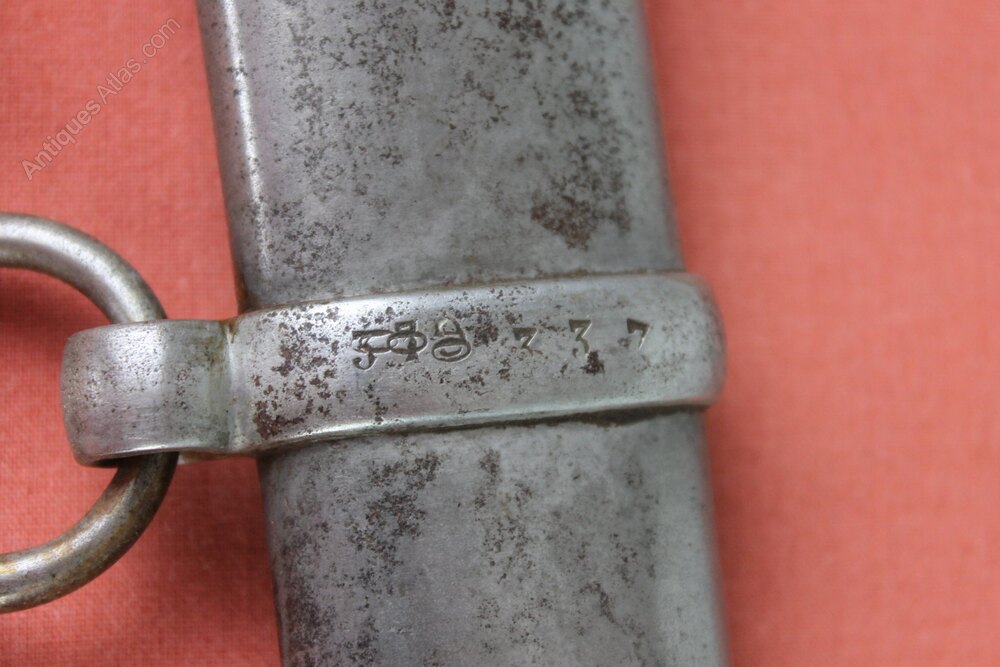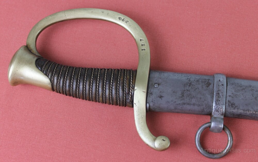 French 2nd Empire mounted artillery sword. Brass wire bound leather grip. Brass hilt numbered 337 reissued and originally numbered 379. Has a steel scabbard which is also numbered 337 reissued from 379. Curved, single edged, tapering blade engraved on spine with place of manufacture and date 1830. In good overall condition with no dents to scabbard.Overall approximately 99cm and blade 80.5cm.