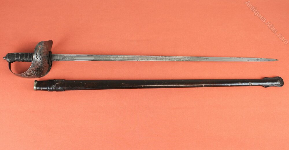 George V Infantry Officers sword in its leather field scabbard. Has a steel pierced hilt with GVR and crown and a silver wire bound shagreen grip. Single edged, acid etched blade which is marked as by Henry Wilkinson and numbered on the back strap 51528. Blade is decorated with Royal Coat of Arms, GVR, cipher and foliage. 'London Made' is etched on the back strap. Blade has lots of original finish but slight staining towards end of blade. General wear overall but good sound condition.Approximately 102cm and blade length 82cm.