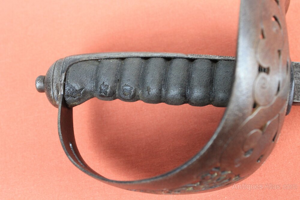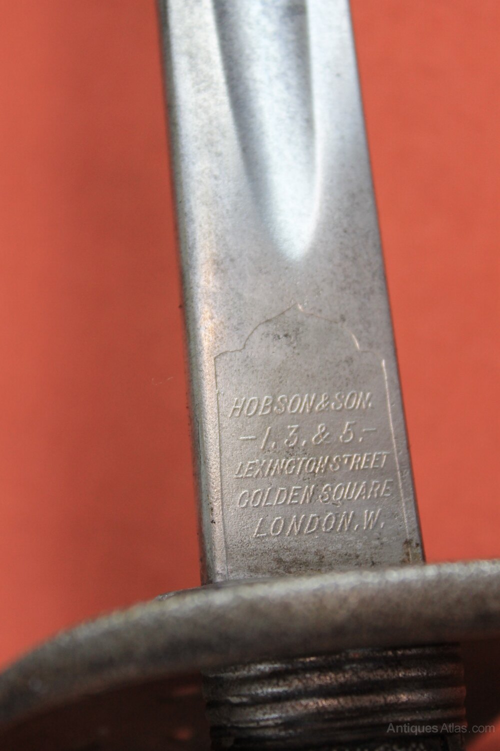 Edward VII NCOs sword in steel scabbard. Has a shagreen grip (no grip wire) and a plain NCO's blade. The blade is solid to the hilt and is etched as by Hobson & Son, 1,3 & 5, Lexington St, Golden Square, London W. In generally sound condition but age wear overall. Minor dent to scabbard.Approximately 101cm overall and blade 82cm.