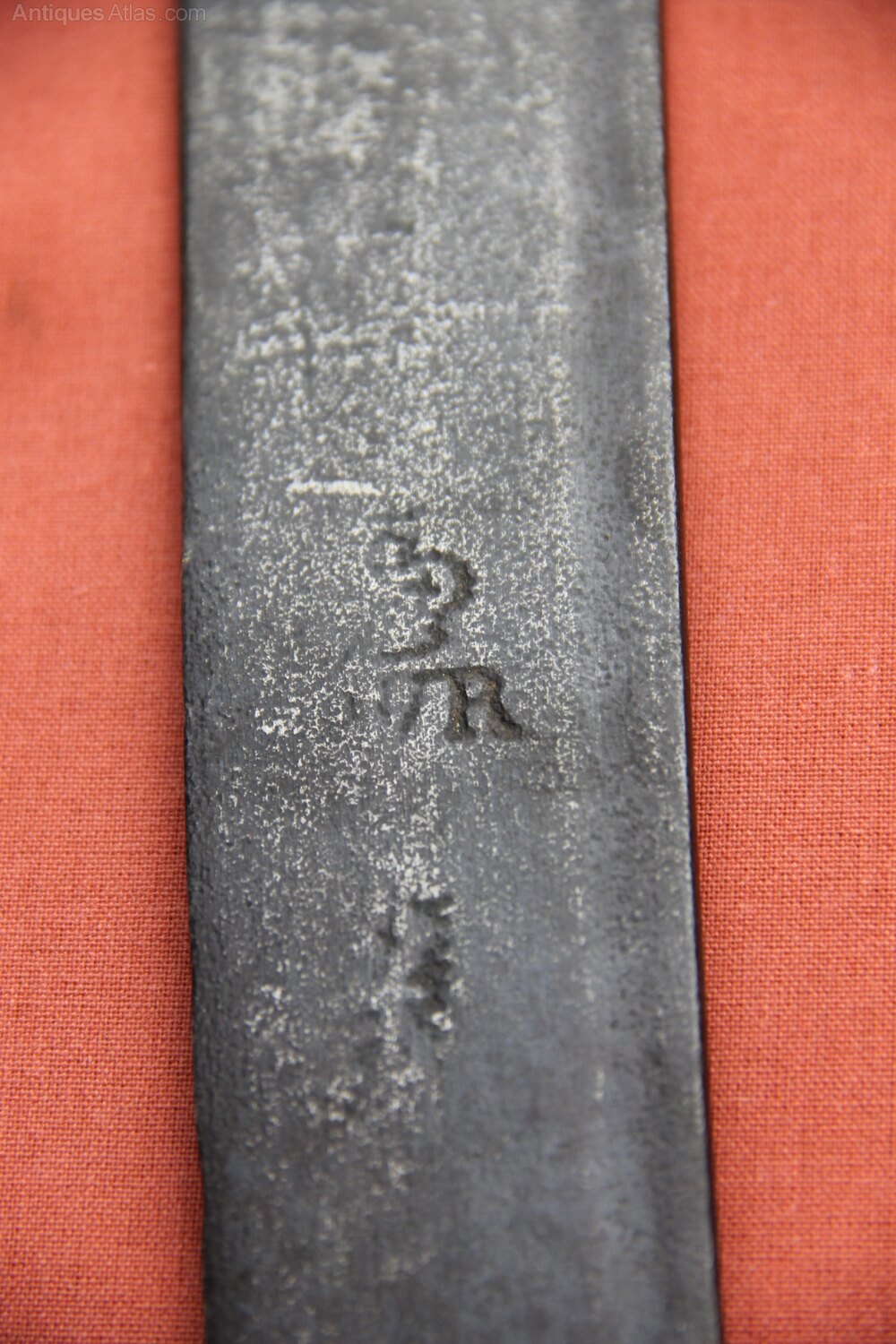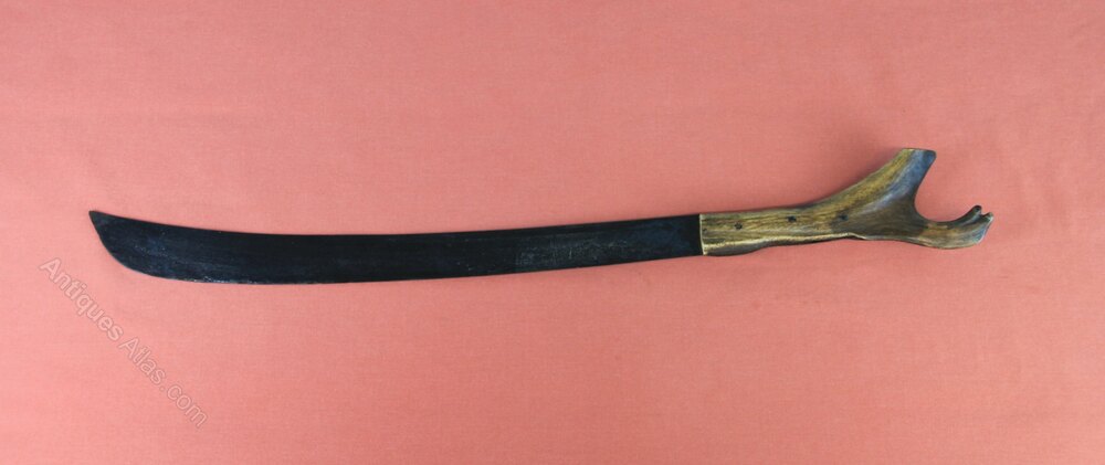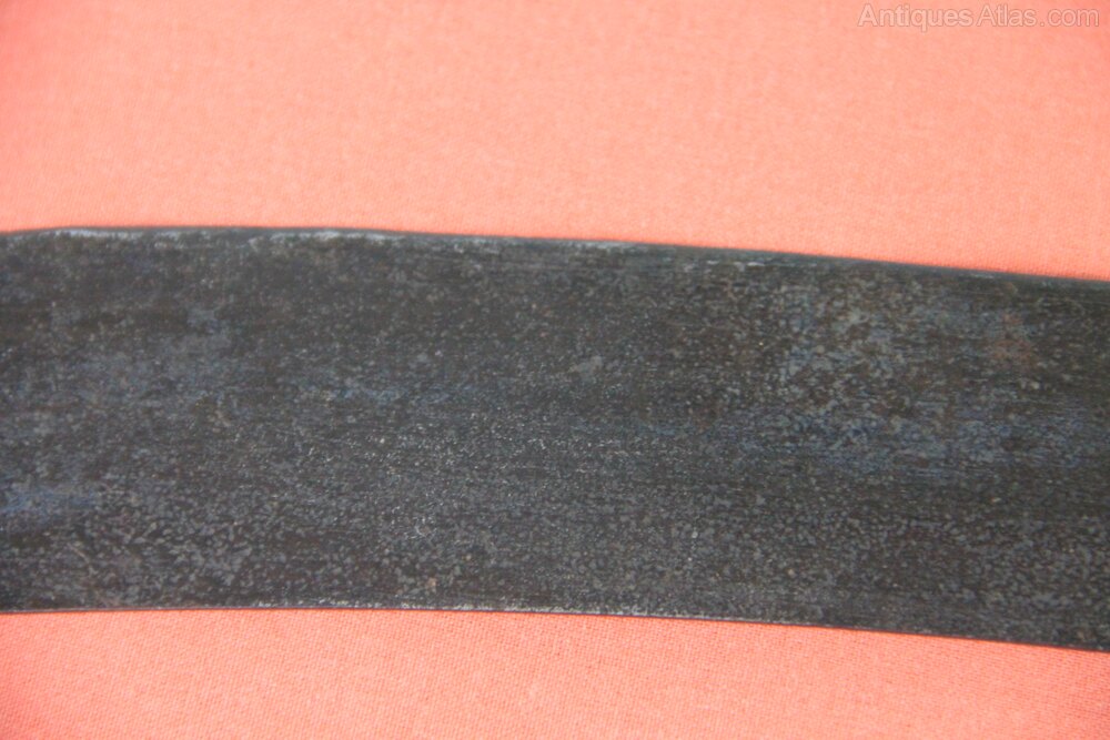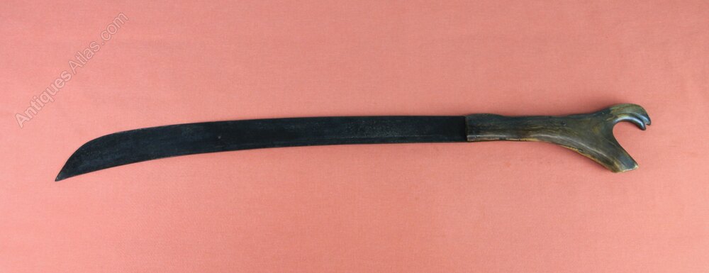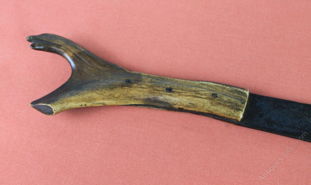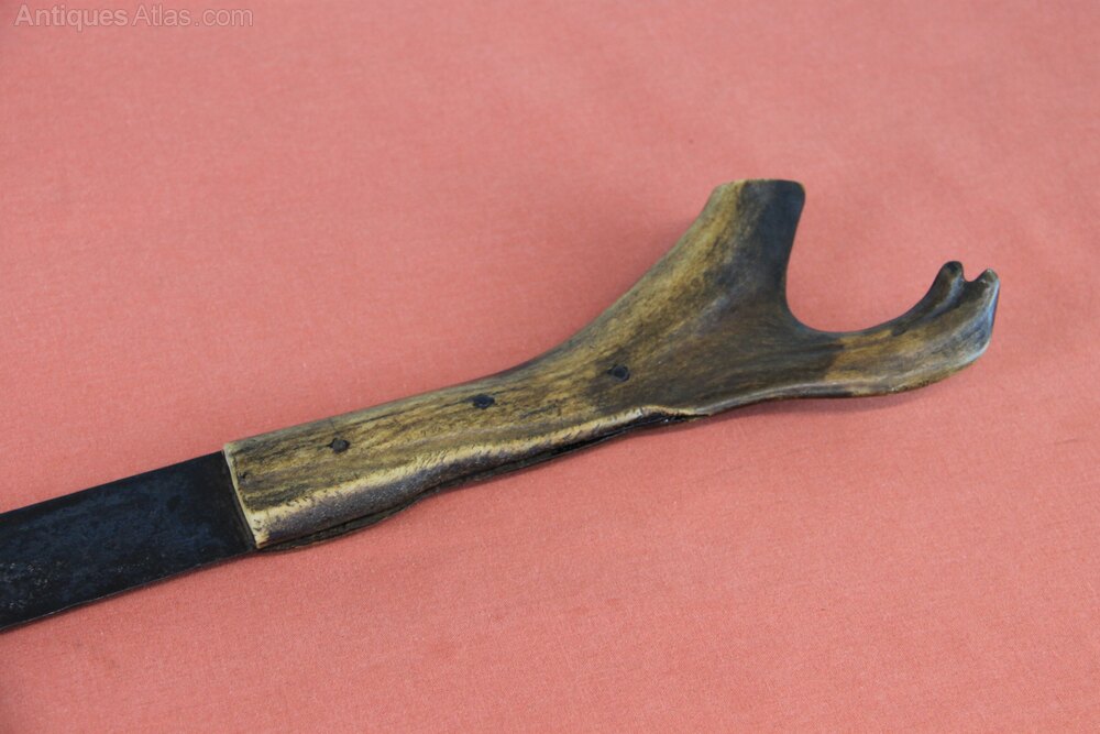 William IV Antler hilted cutlass or machete. Note there is no scabbard with this item. Has a one piece stag antler grip. There is a curved, broad blade with single fuller. Blade is stamped with crown and WR and makers mark. In sound condition but blade rust stained overall.Approximately 73cm overall and blade 49.5cm.