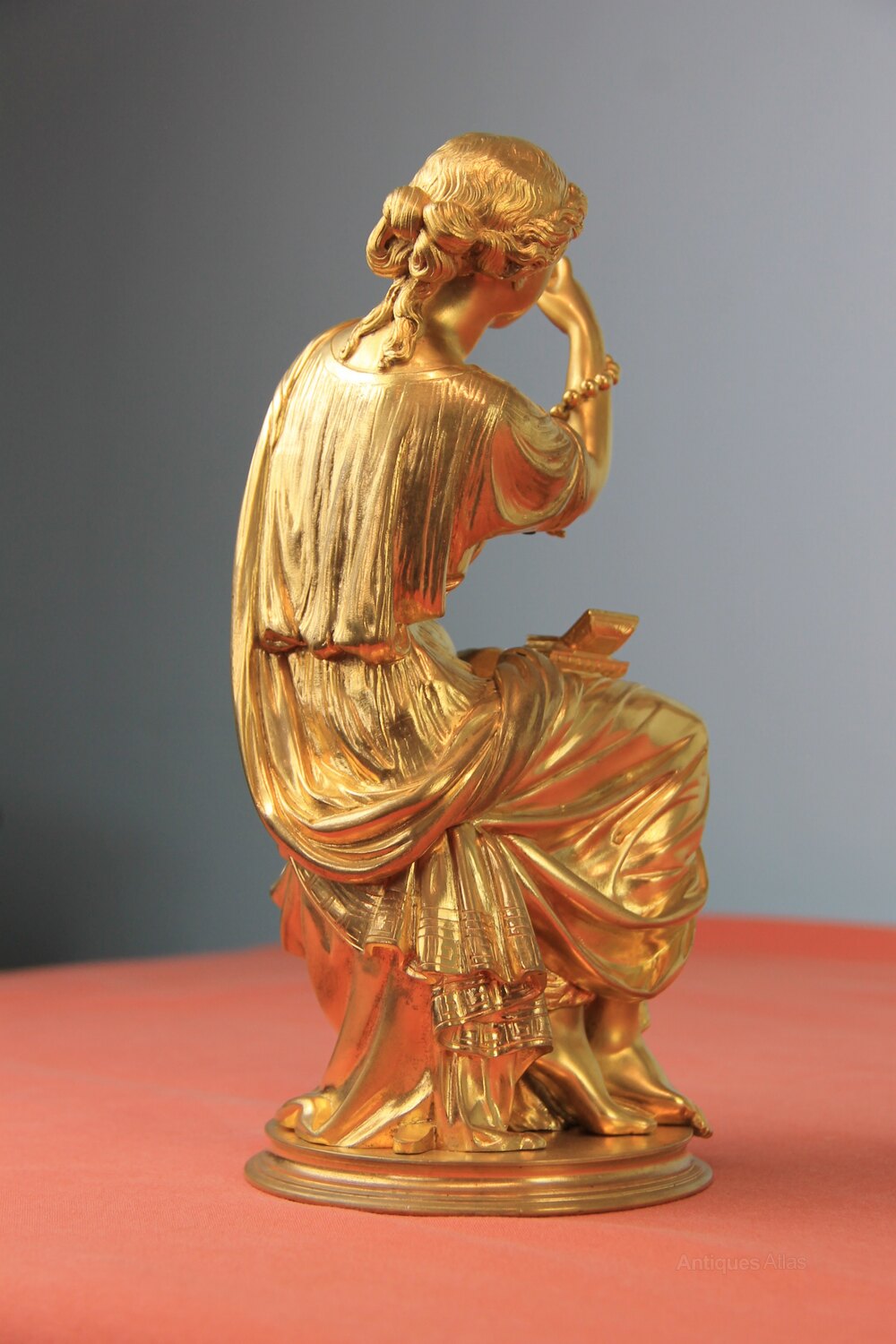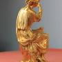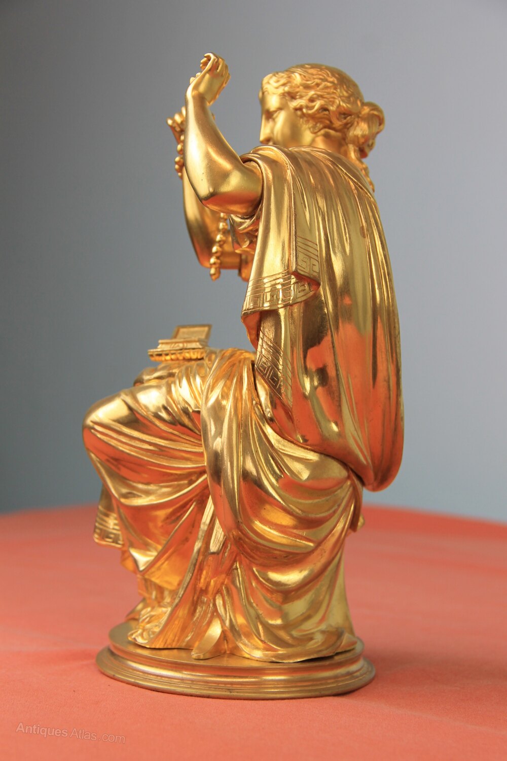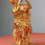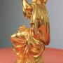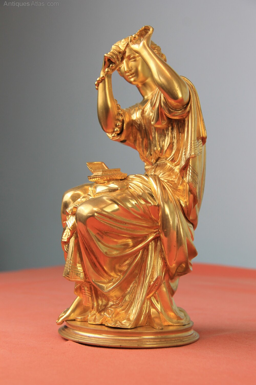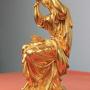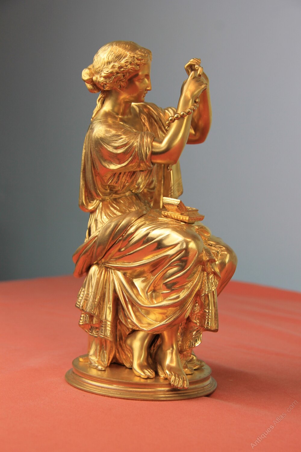 French gilded bronze statue of a seated classical lady threading pearls from a jewellery box. Made in the mid/late 19th century. Constructed in 5 sections on a turned base with very good gilding. Originally this would have been mounted on a clock.Approximately 26cm high and base 11cm in diameter.