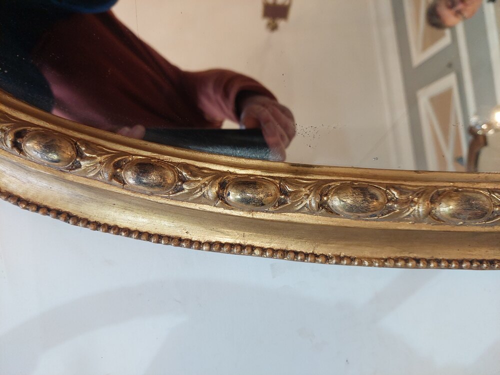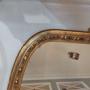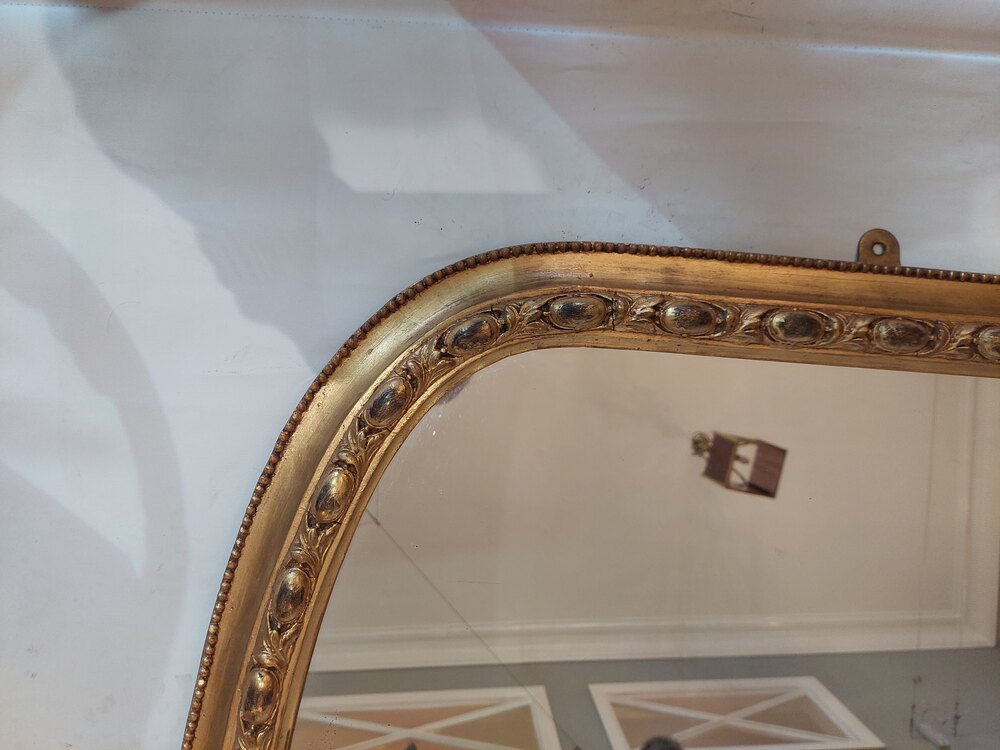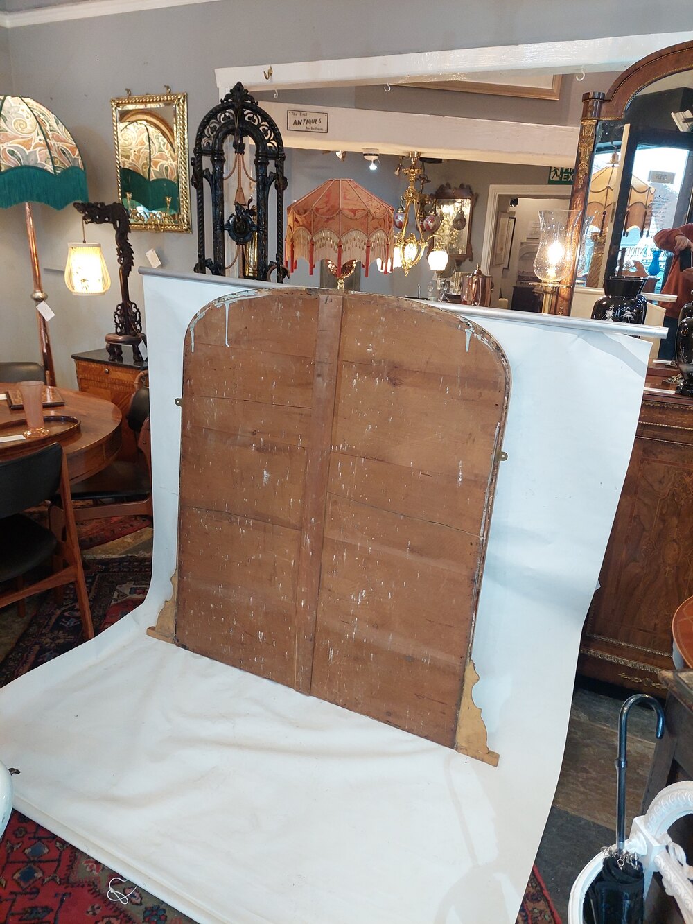 Victorian Giltwood & Gesso Overmantle Wall Mirror of arched form with beaded edge, around egg moulded frame with scroll end supports - 53"w x 52"hDateMid Victorian