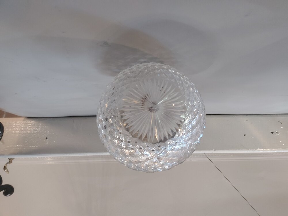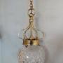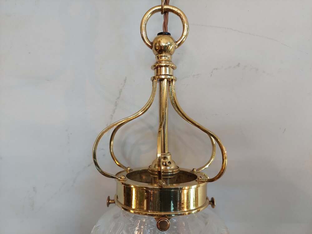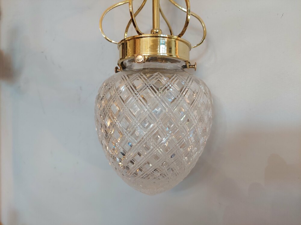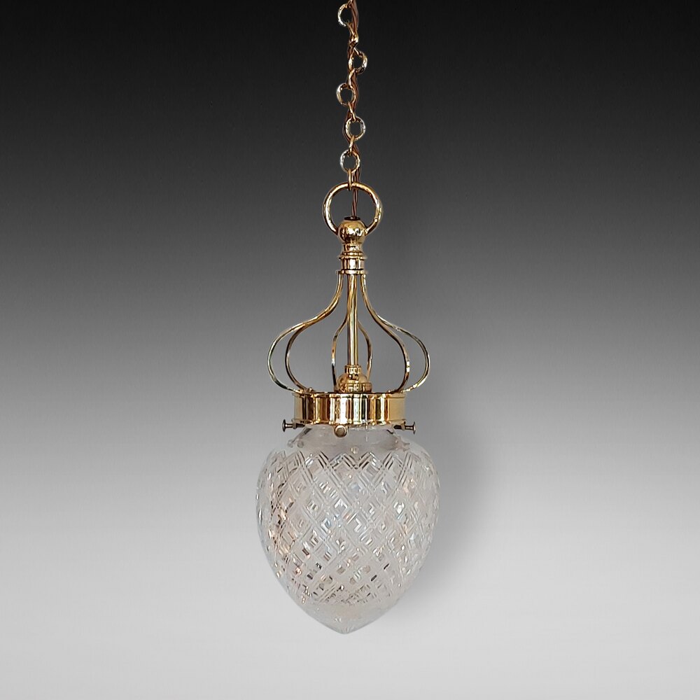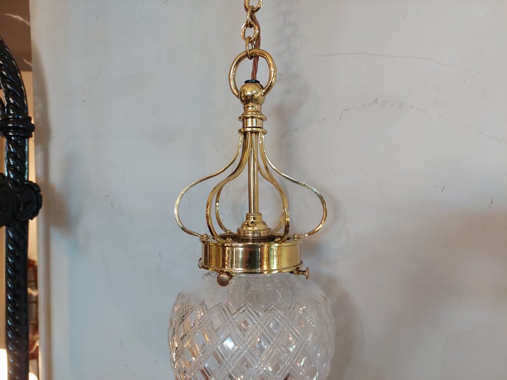 Early 20thC Cut Crystal and Brass Ceiling Lamp with Art Nouveau style crown and ceiling rose - 6" diam x 25"h chain can be lengthened or shortened - all lights and lamps have been rewired with authentic corded flex, fitted with either foot switch or finger clicker switch and are Pat testedDateArt Nouveau