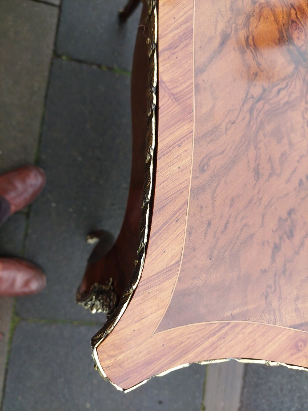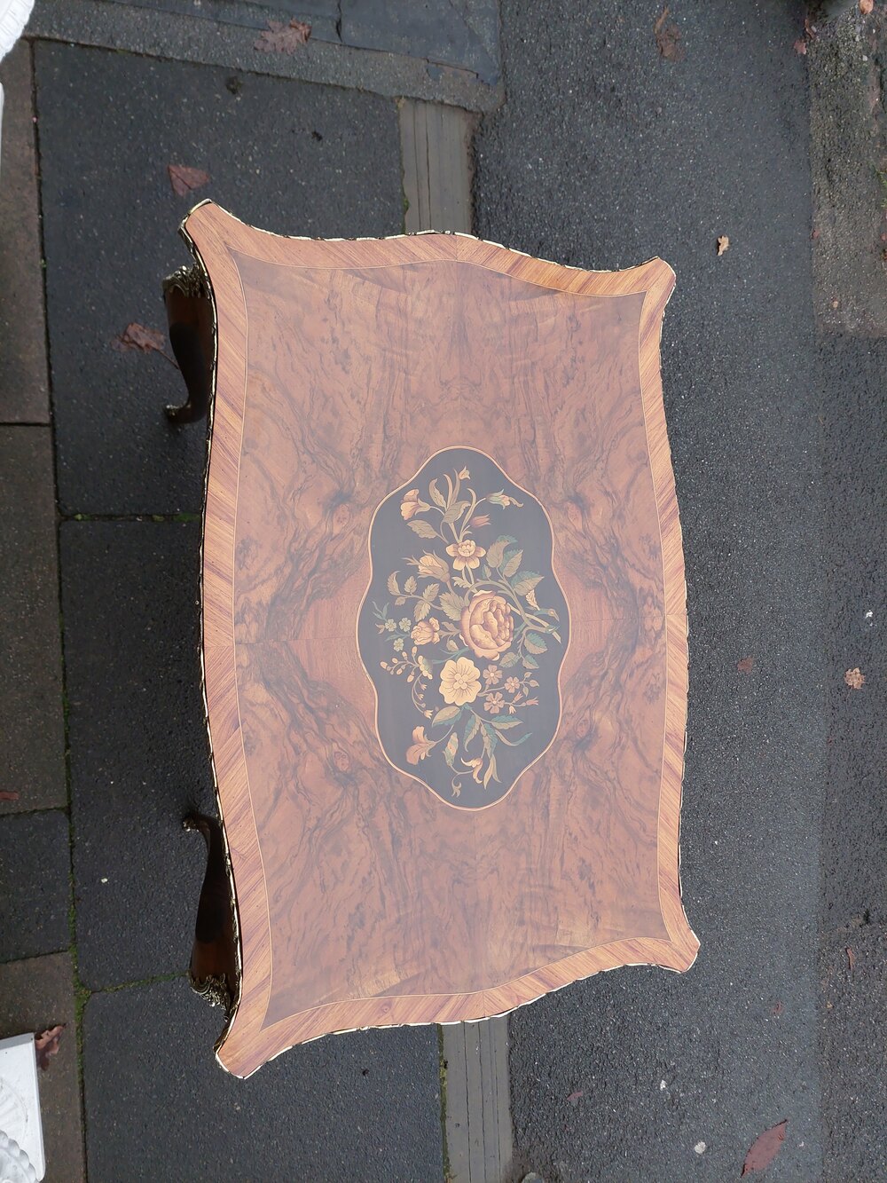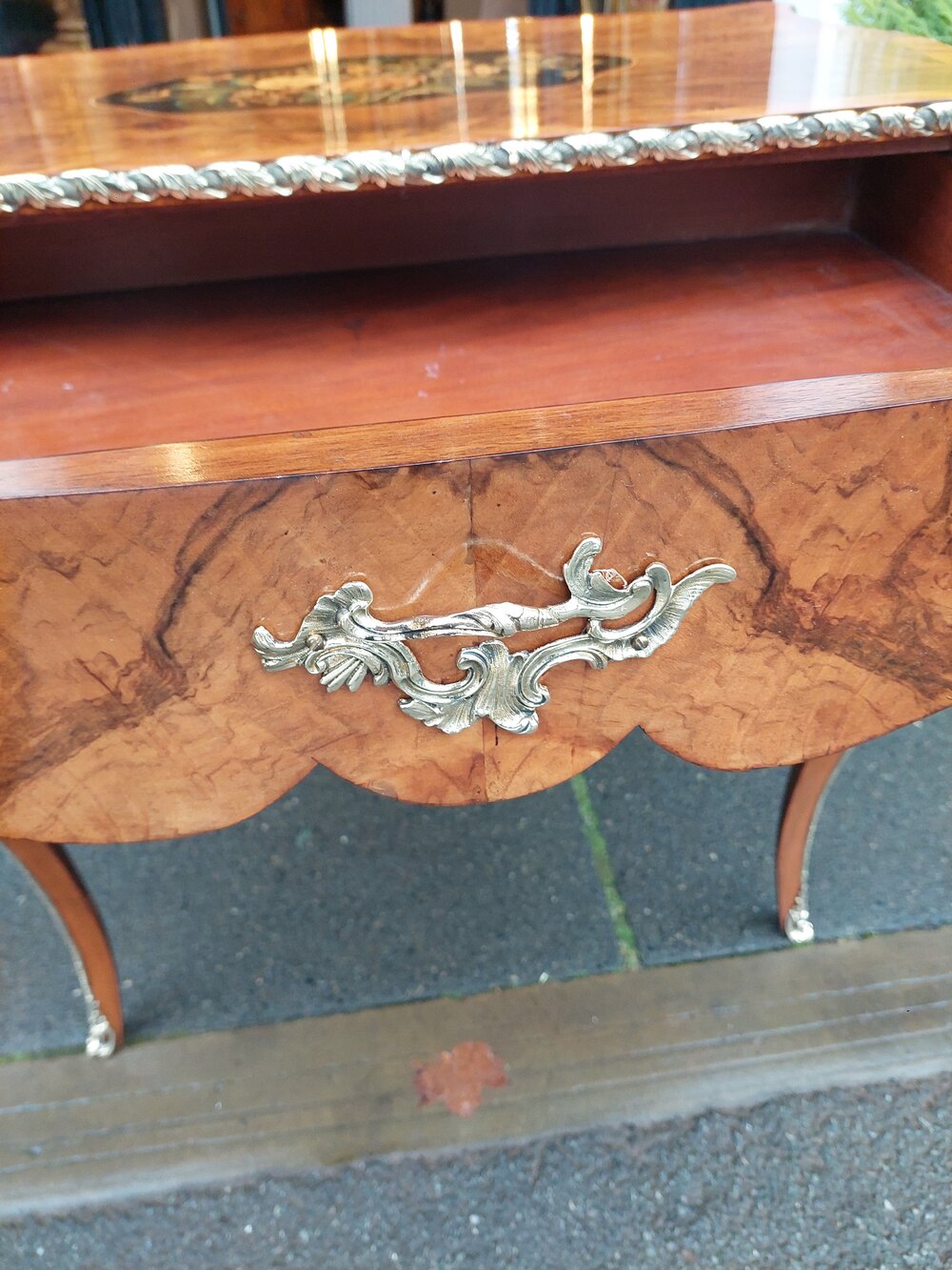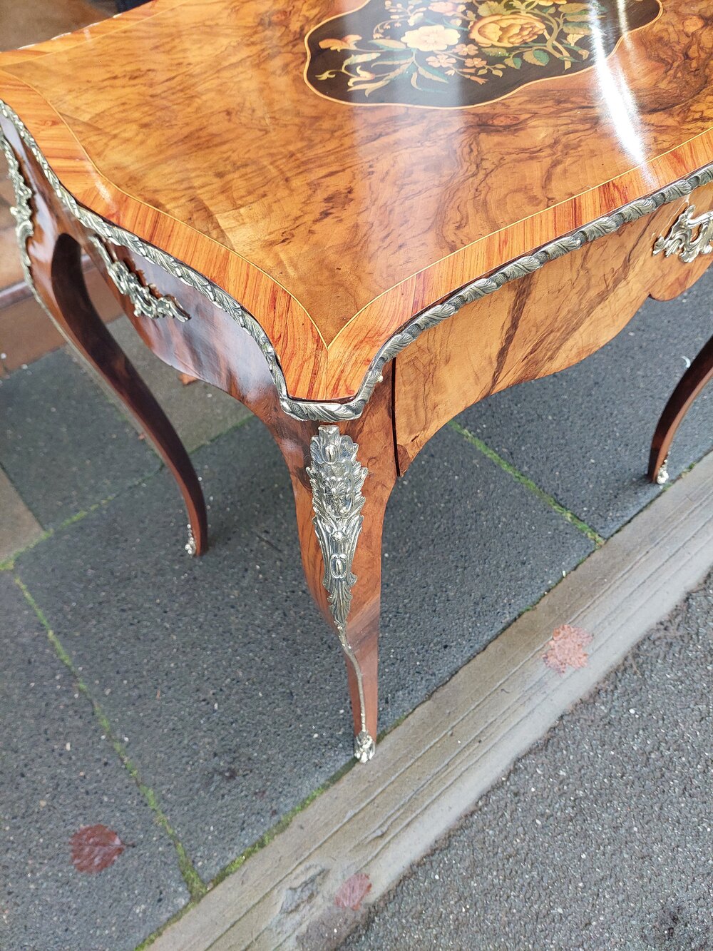 Early 20thC French Walnut Table with marquetry inlays and gilt brass mounts, single frieze drawer over slender cabriole shaped legs - 30"w x 20"d x 29.5"hDateEarly 20th Century