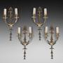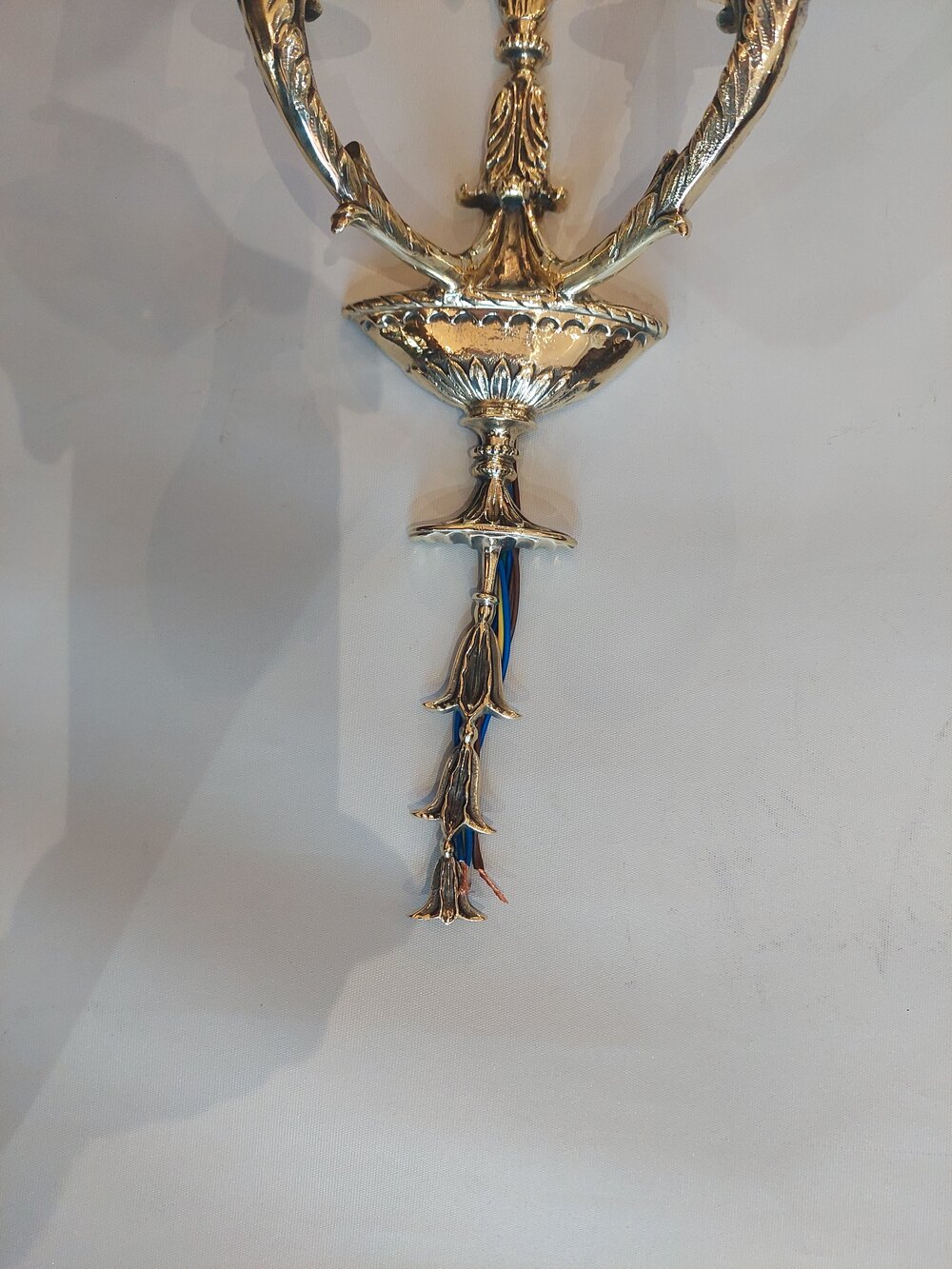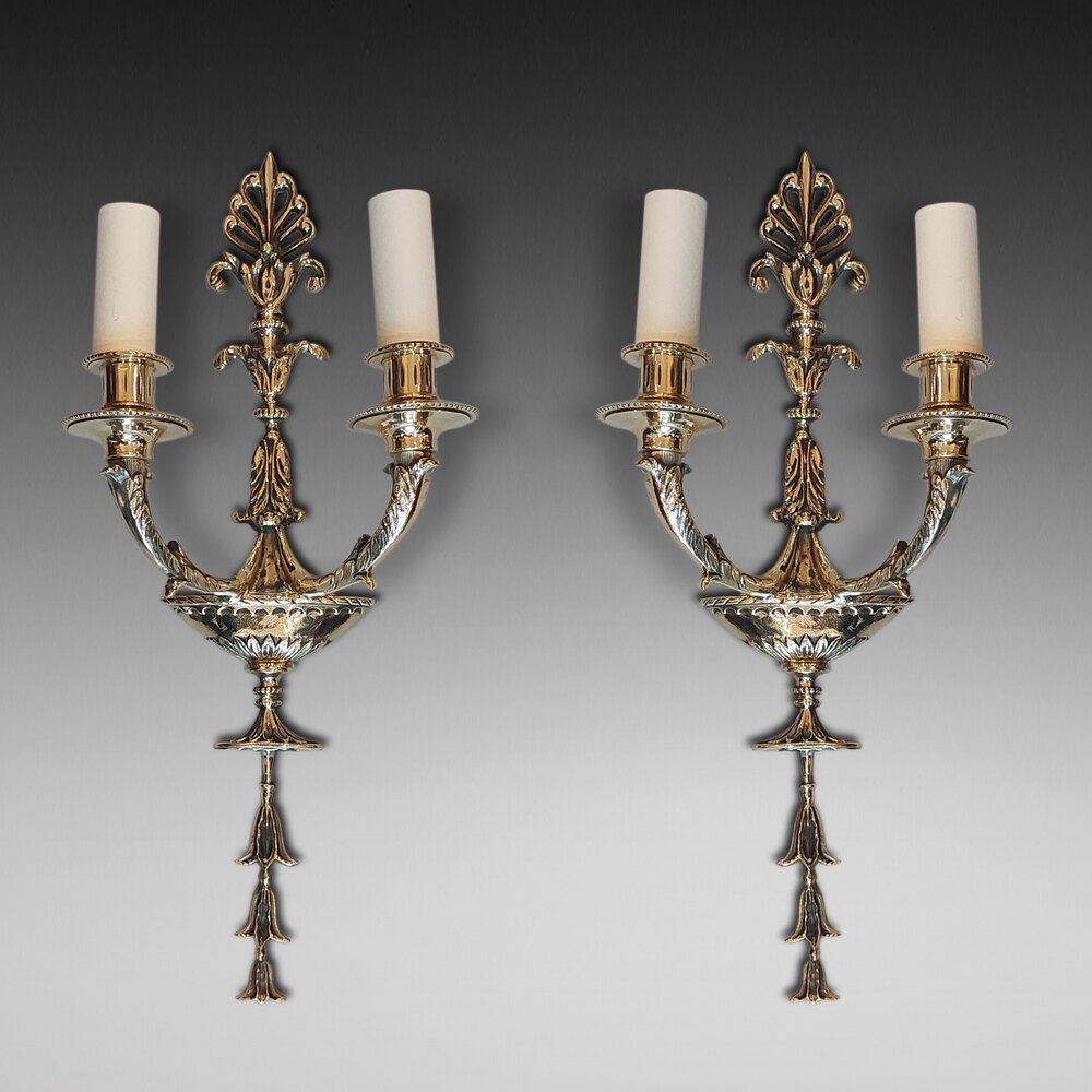Set of Four Early 20thC Gilt Brass Adam Style Wall Hanging Lights - with urn-shaped backs and two branch light fittings to each - 7.5"w x 4.5"d x 16"h - all lights and lamps have been rewired with authentic corded flex, fitted with either foot switch or finger clicker switch and are Pat testedDateEarly 20th Century