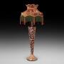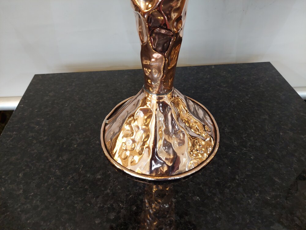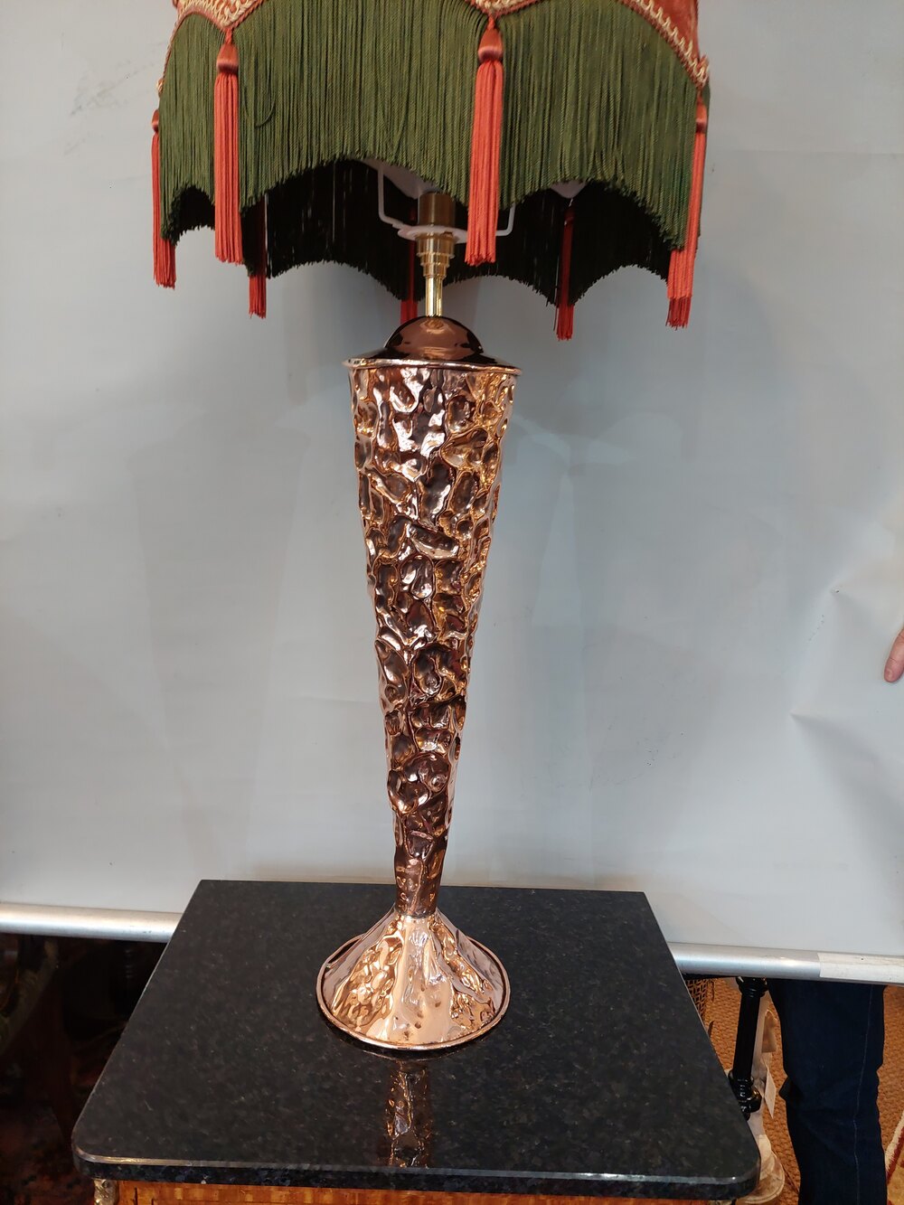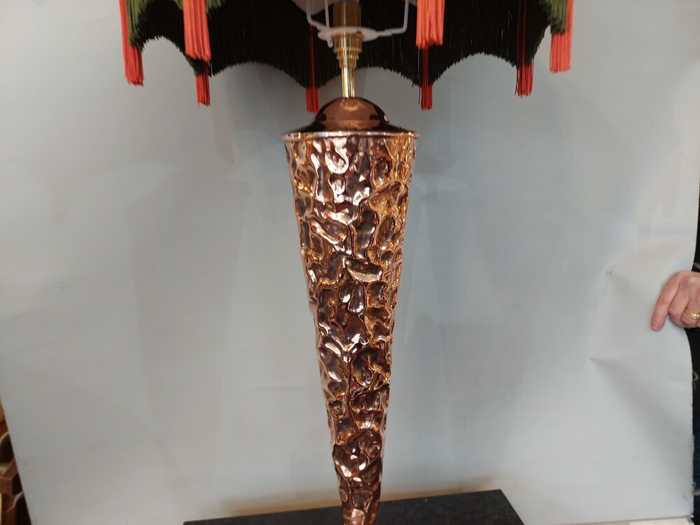 Arts and Crafts Beaten Copper Stick Stand converted to a Table Lamp - 16" diam x 36"h - The lampshade(s) are newly handmade silks by the same maker as provides the shades for Downton Abbey - all lights and lamps have been rewired with authentic corded flex, fitted with either foot switch or finger clicker switch and are Pat testedDateArts and Crafts