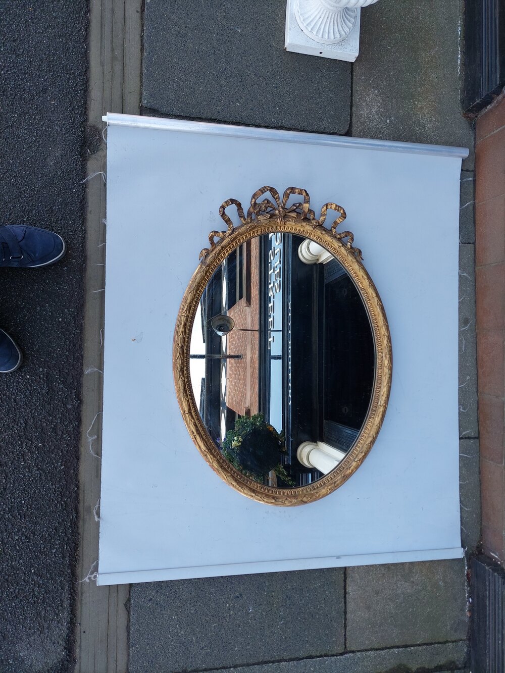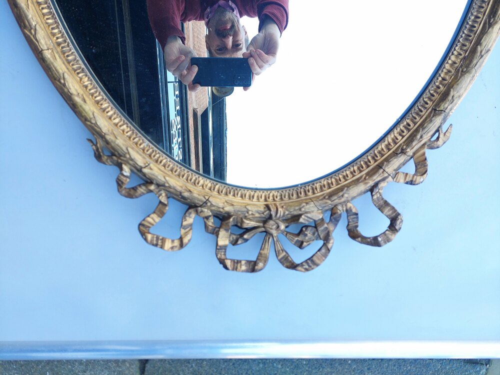 Mid 19thC Louis XVI-style Oval Giltwood Wall Mirror - featuring carved foliate, scroll and ribbon motifs - 26"w x 2"d x 36"hDateVictorian