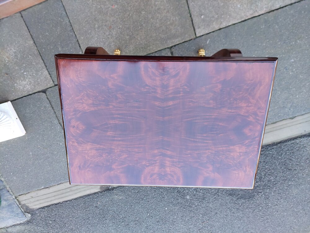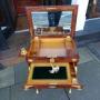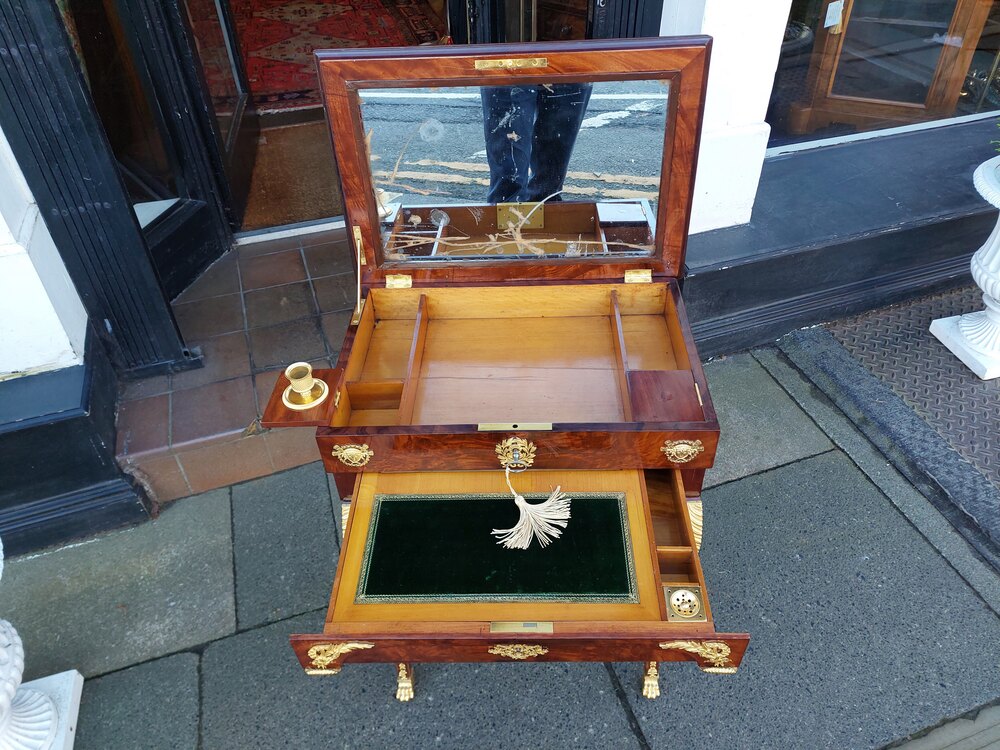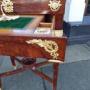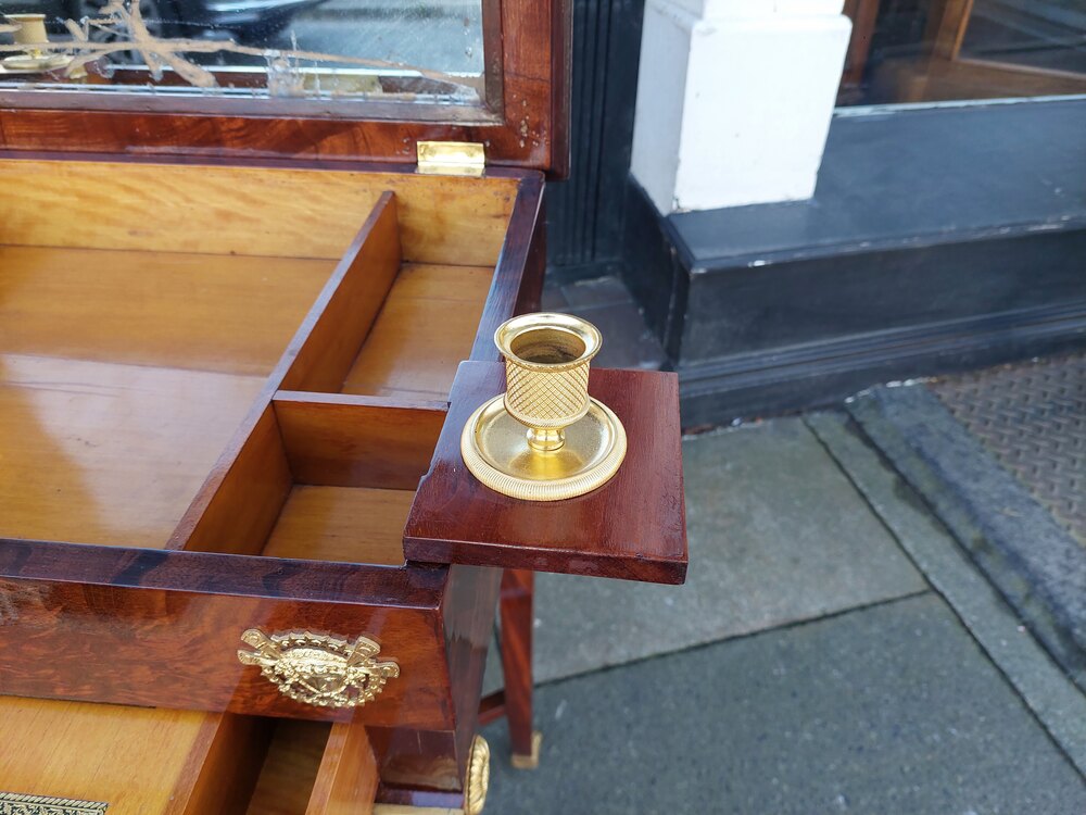 Late 19thC French Mahogany and Satinwood writing Desk with Lidded Leather drawer and Gold Plated Candle Holders, Inkwell and Decorations - 21"w x 16"d x 29.5"hDateMid Victorian