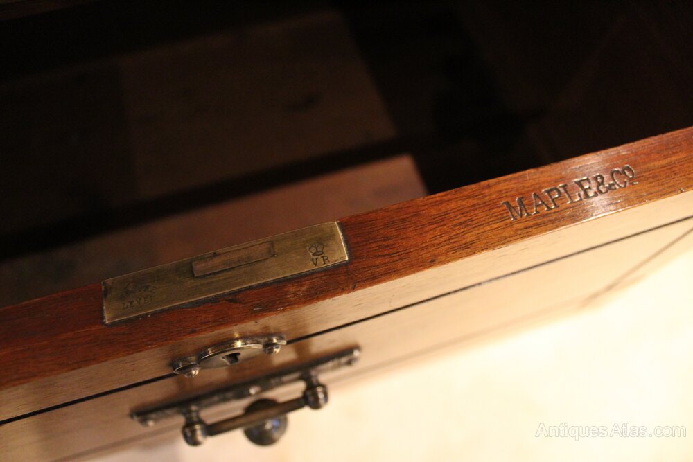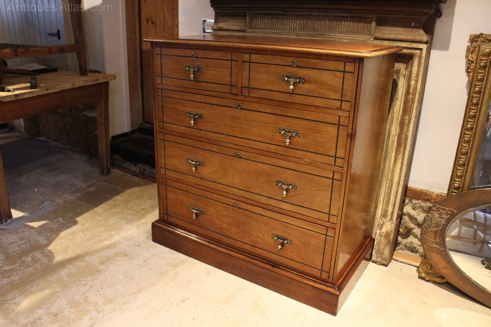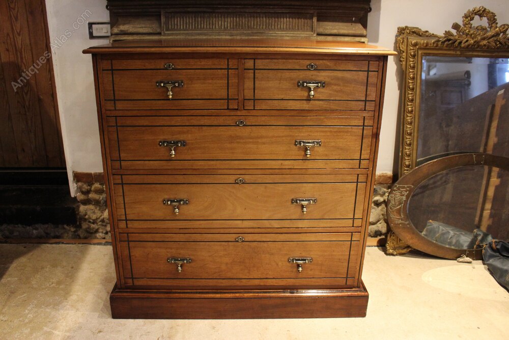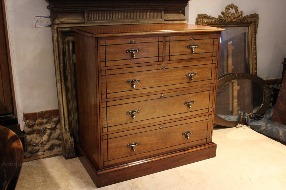 Here we have a truly exceptional piece of cabinet making from the famous firm of Maple and Co London. This solid Walnut arts and crafts chest has great colour and patina. The top has super grain and a stepped moulded edge with ebonised string. Below there is s desirable configuration of two over three drawers. The drawers are all solid Mahogany lined with the finest hand cut dove tail joints and internal dust bead quadrants. There are original and fine quality brass pulls and escutcheons. The ebonised string to the top is replicated with beautiful line decor on the front of the drawers. The top drawer is stamped for Maple and Co and the locks all have the VR cipher for Queen Victoria. The whole sits on and original plinth base. A super chest of really great proportions in excellent retail condition ready for your home. The the dimensions areapprox 110 cm high 106 cm wide 54 cm deep.Buy from a trusted LAPADA dealer
