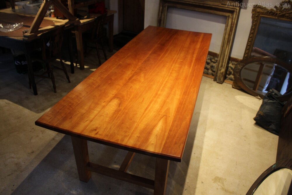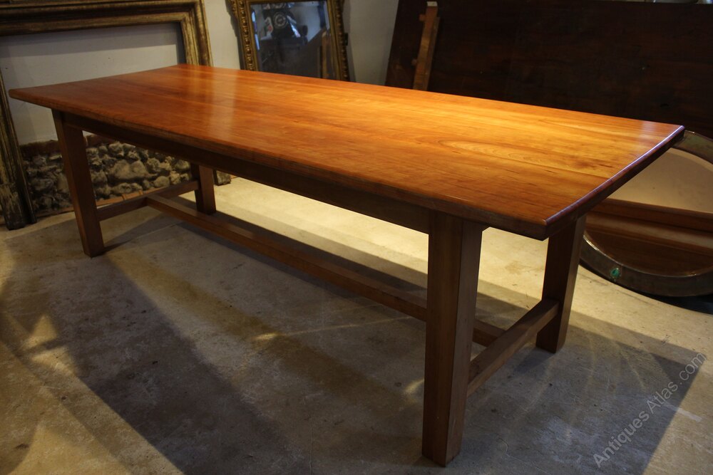 Here we have a fine quality solid Cherry wood refectory dining table by Heals of London c1980. As you can see the table has stunning colour and patina. There are carefully selected thick planks to the top with super grain. There is a shallow frieze and squared and tapered legs joined by an H stretcher. The table will seat 10 people and is in fantastic retail condition ready for your home. The dimensions are approx 247 cm long 90 cm deep 77 cm high.Buy from a trusted LAPADA dealer