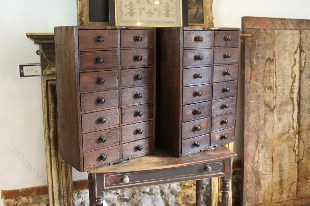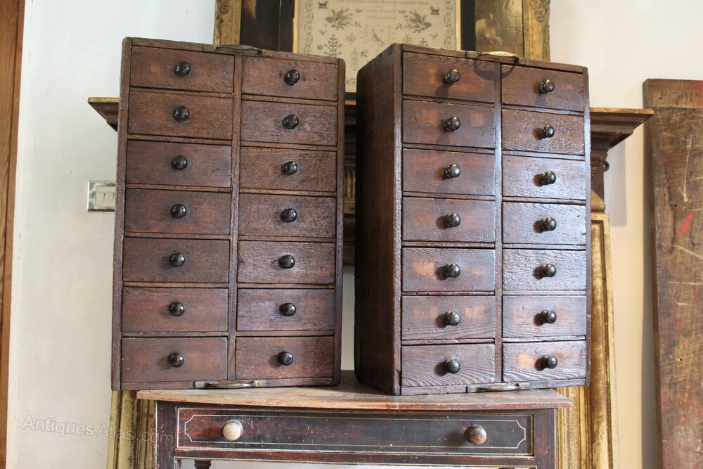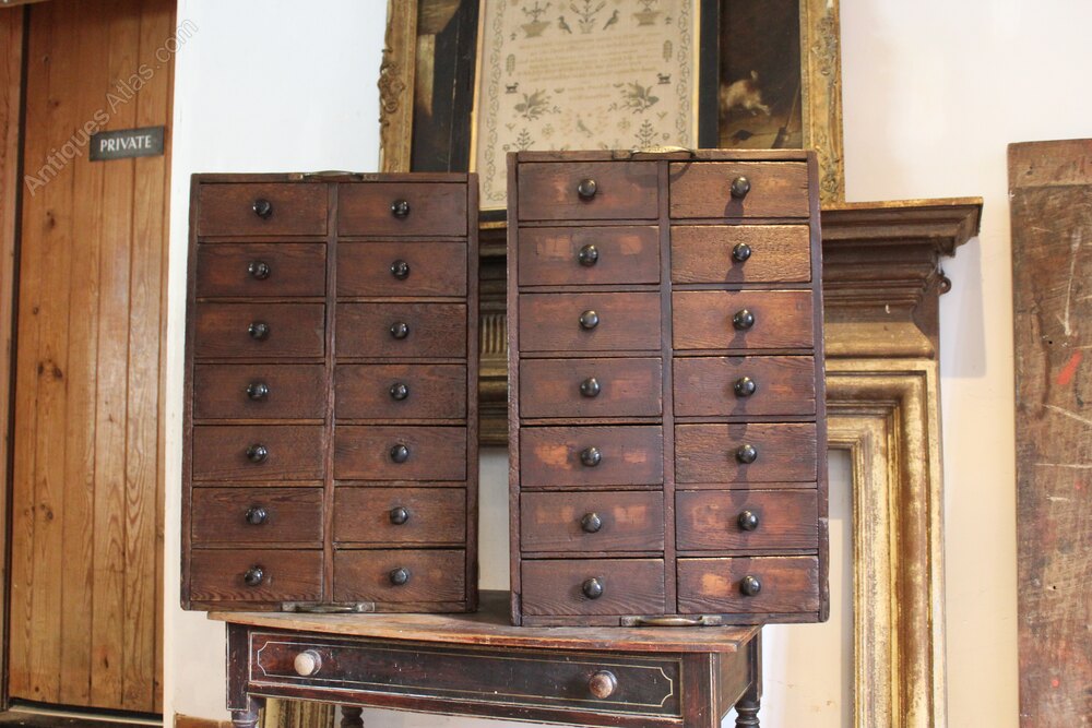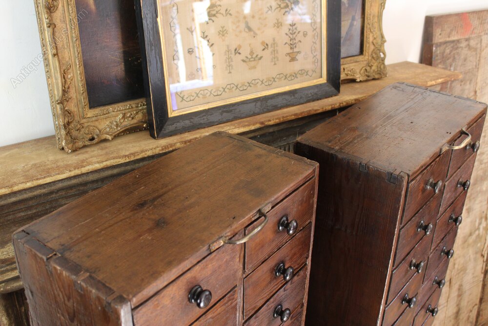 Here we have a rare pair of Victorian banks or chests of drawers c1880. As you can see the drawers have great colour and patina. The drawers were in the inventory of D Napier and sons an engineering company from 1808 and a luxury car maker in the early 20th century. Original brass carrying handles and turned handles. The drawers have hand cut dovetail joints. The whole carcass is also constructed with hand cut dovetail joints. A super pair which could be sold separately in great retail condition ready for your home. The dimensions areapprox 68 cm high 45 cm wide 26 cm deep.Buy from a trusted LAPADA dealer