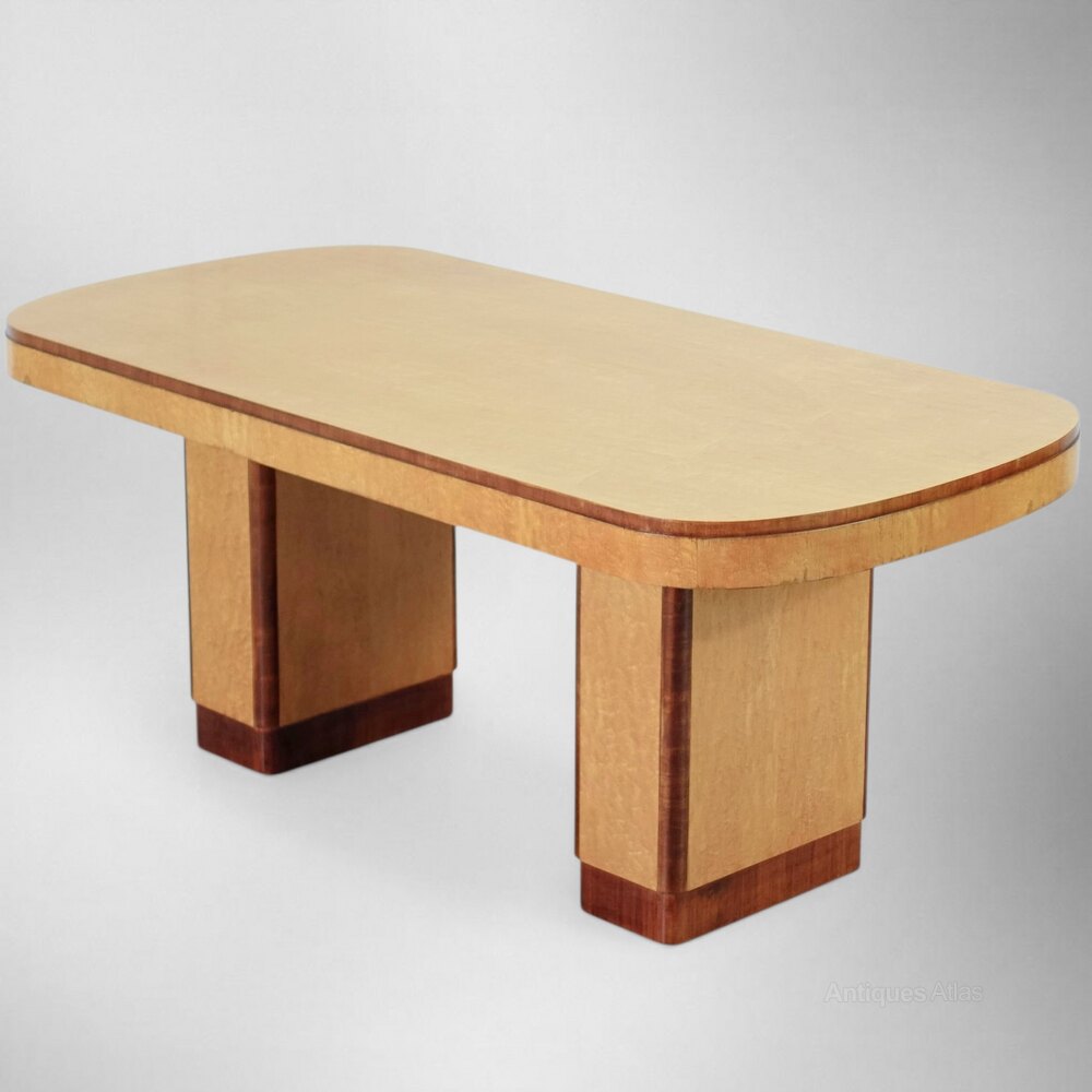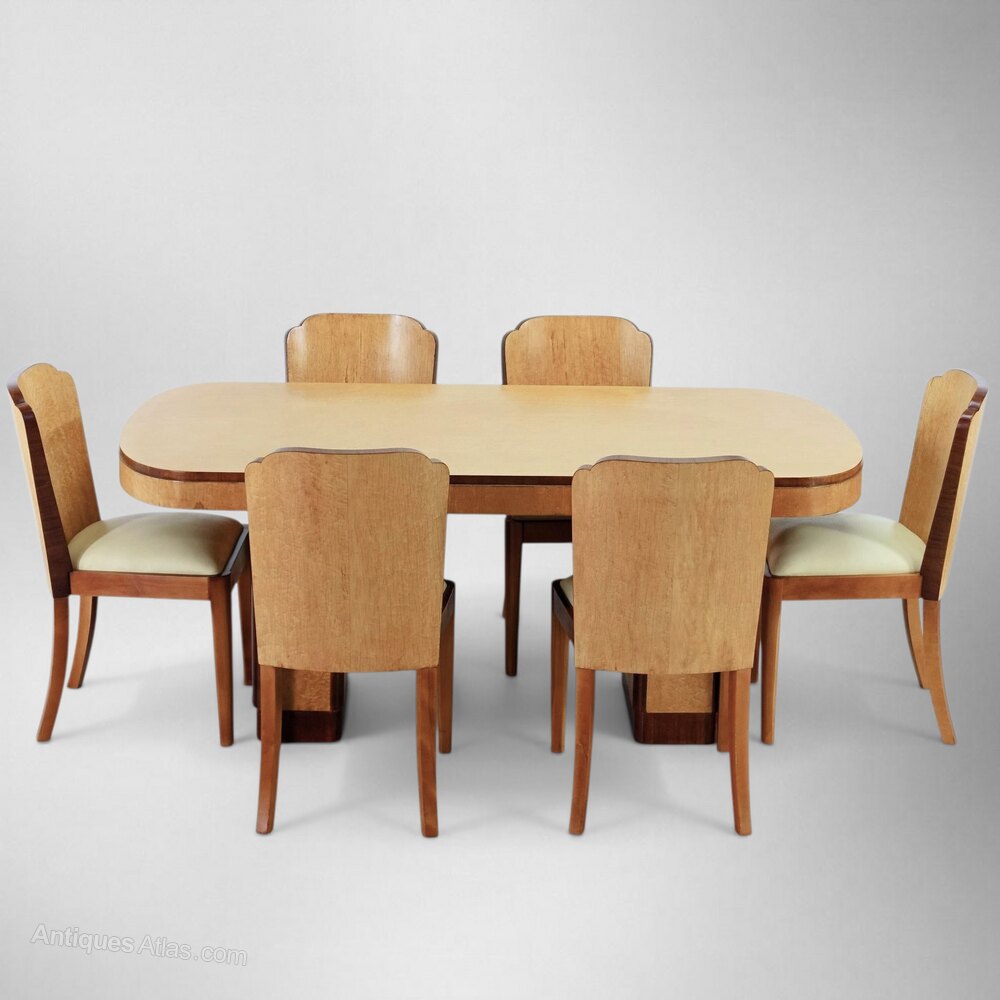 Original Art Deco Dining Table and 6 chairs in Birds Eye Maple and Walnut upholstered in cream leather . Harry & Lou Epstein circa 1930.A fine quality Art deco dining table and 6 chairs in Birds Eye Maple and Walnut Designed and handmade in England by Harry and Lou Epstein. Circa 1930.