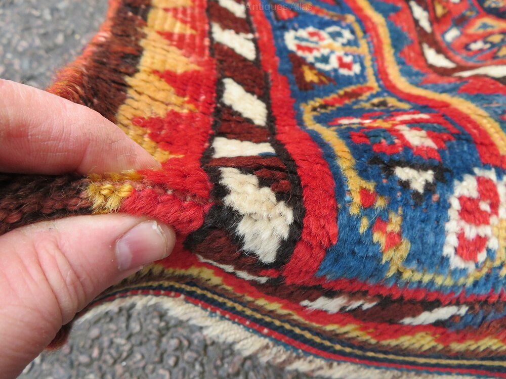 ENDS AND SIDES SECURED. SOME LOWER PILE IN PLACES. A CHARMING LARGE SCALE TRIBAL RUG WITH A SCARCE PATTERN.