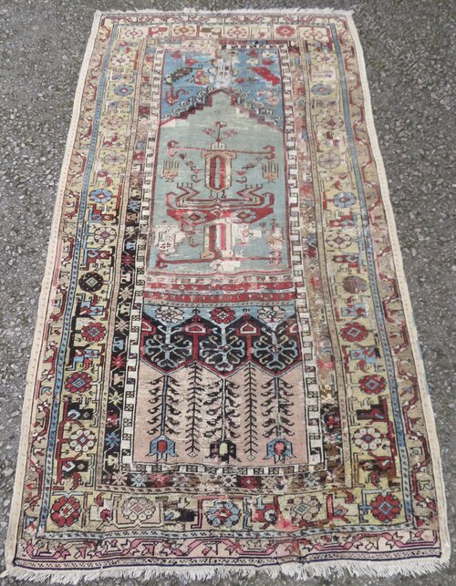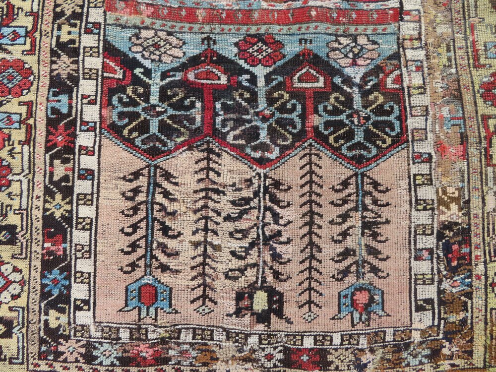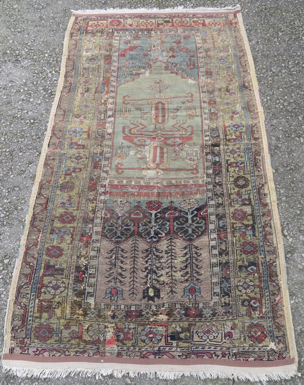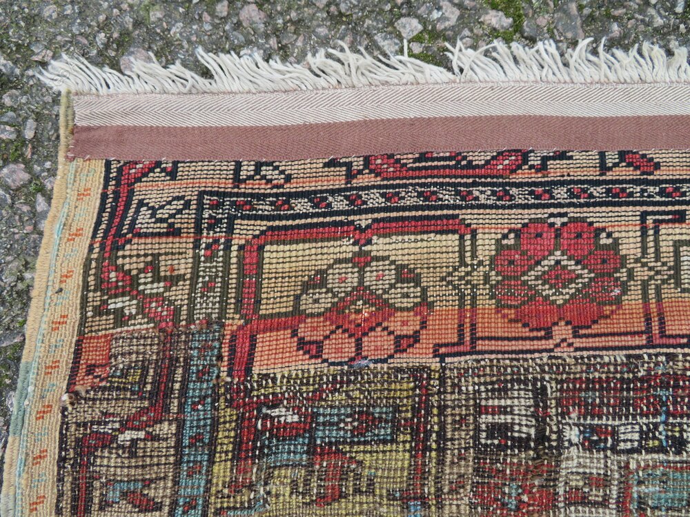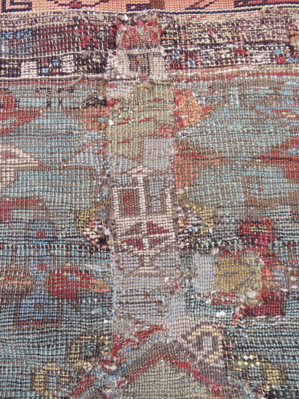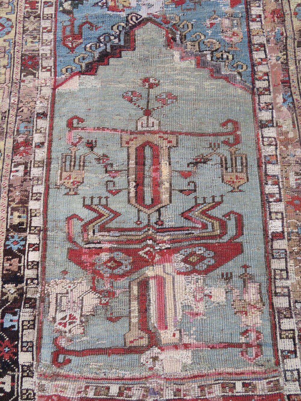 Konya region,central anatolia,2nd half 18th century. Hard to find these rugs from this period. Nice to find an aquamarine central ground colour instead of the more usual reds. Pale blues and yellow also better. Has had both ends rewoven and the sides,numerous reweaves,all imaged,all historic. Many images of the back of the rug. 6 foot 8 inches x 3 foot 9 inches. 203cm x 114cm. At widest points. Fringes not measured in size. Wool construction with the reweaves with cotton warps. Still with presence and look great hung from walls. Price takes into account it isn''t in perfect conditionu. K post £20. Now selling reasonably priced antique rugs and carpets by comparison. Tak 40. Constantly sourcing unusual quality tribal rugs & carpets at trade prices by comparison.