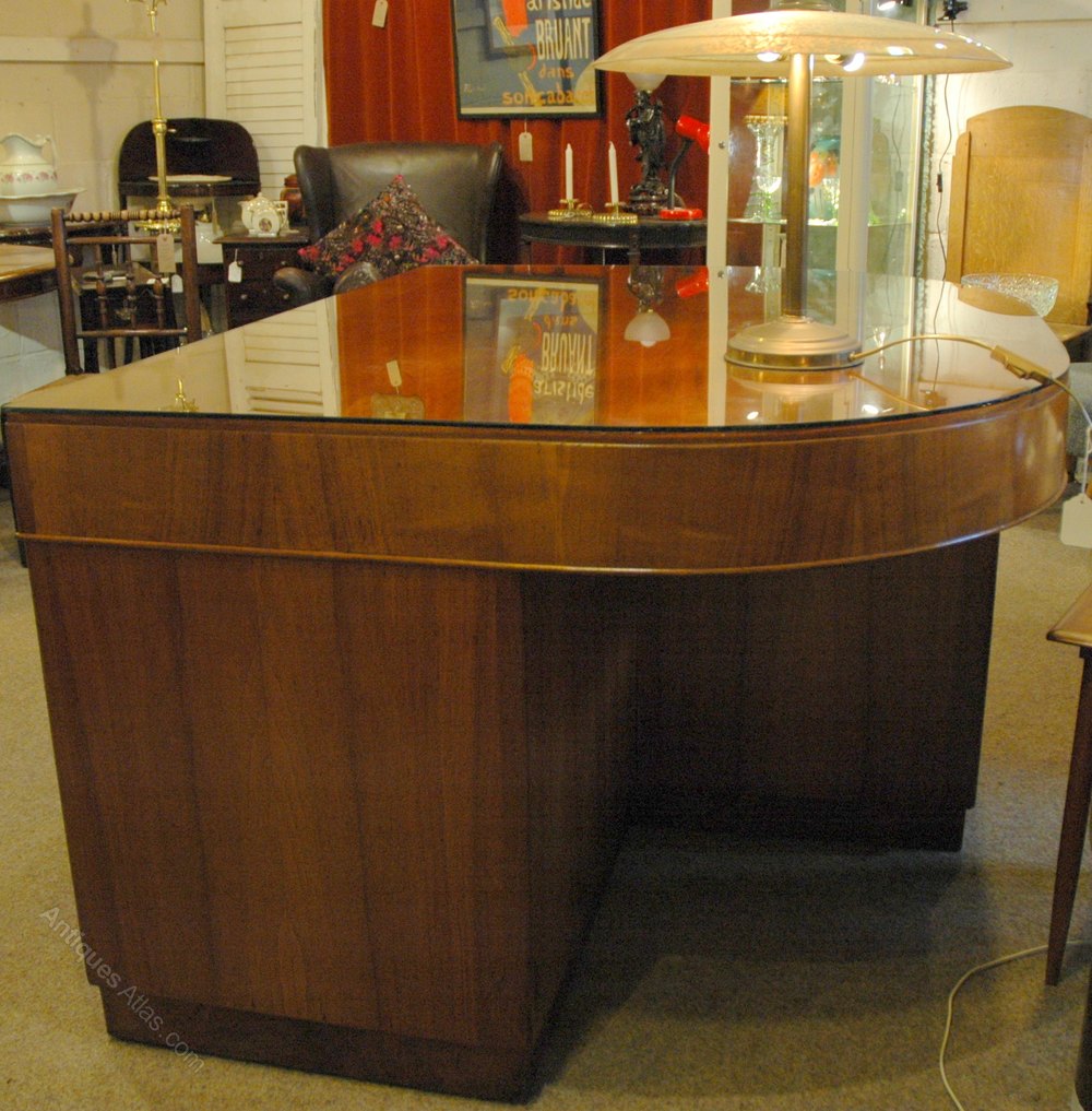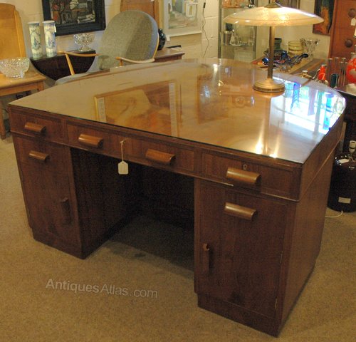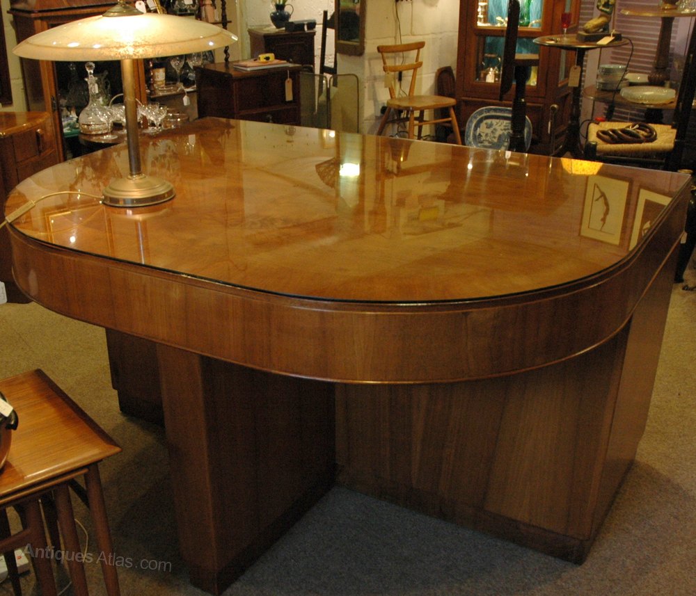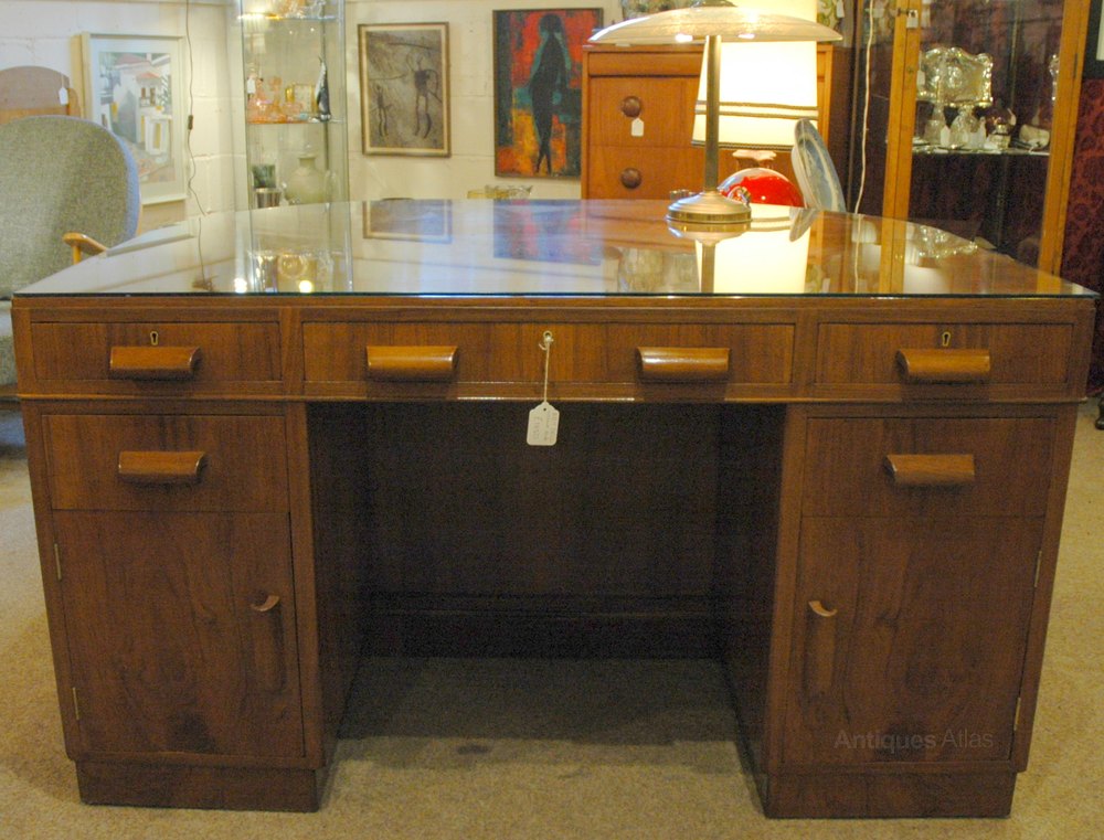 An unusual Art Deco sweeping walnut Desk with glass top over one long drawer and two short drawers, each pedestal having one short drawer over a cupboard.Height 76cms width 138cms depth 107cms