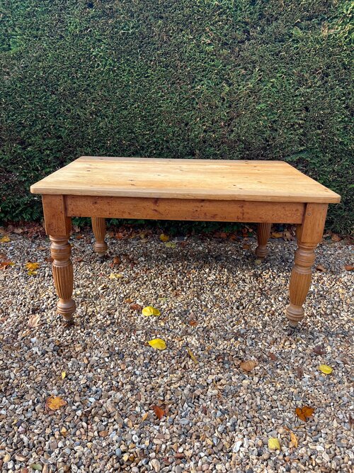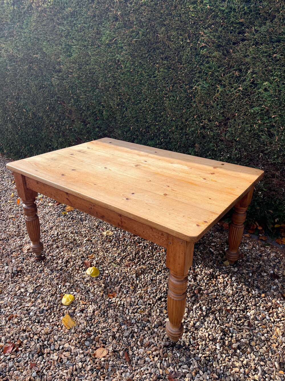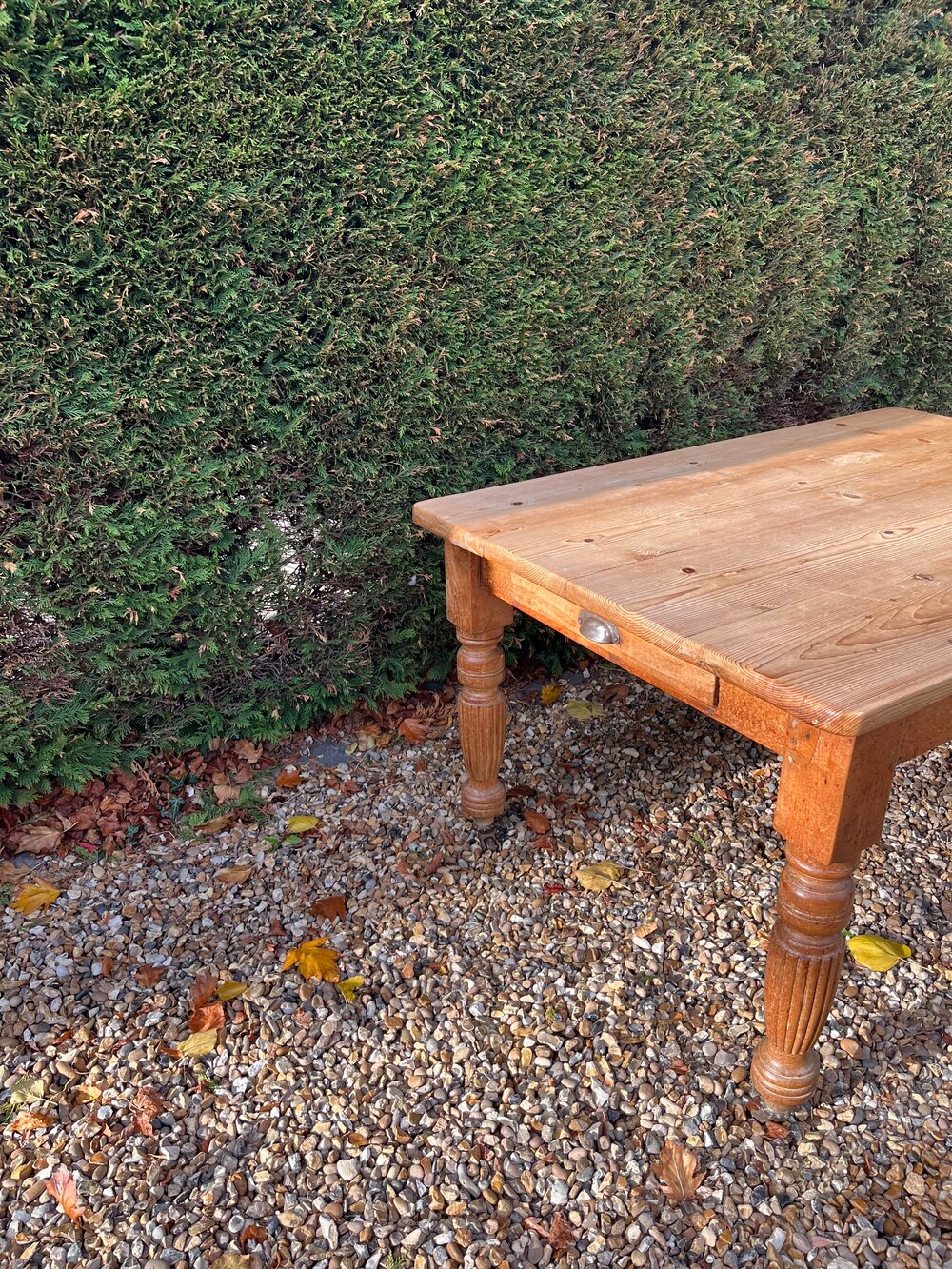 Victorian scrub-top pine farmhouse table with drawer. It has reeded balustrade legs and its original brown porcelain castors. It is 137cm long, 95cm wide and 77cm high. It has marks and wear commensurate with its age and previous use.DateVictorian