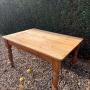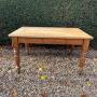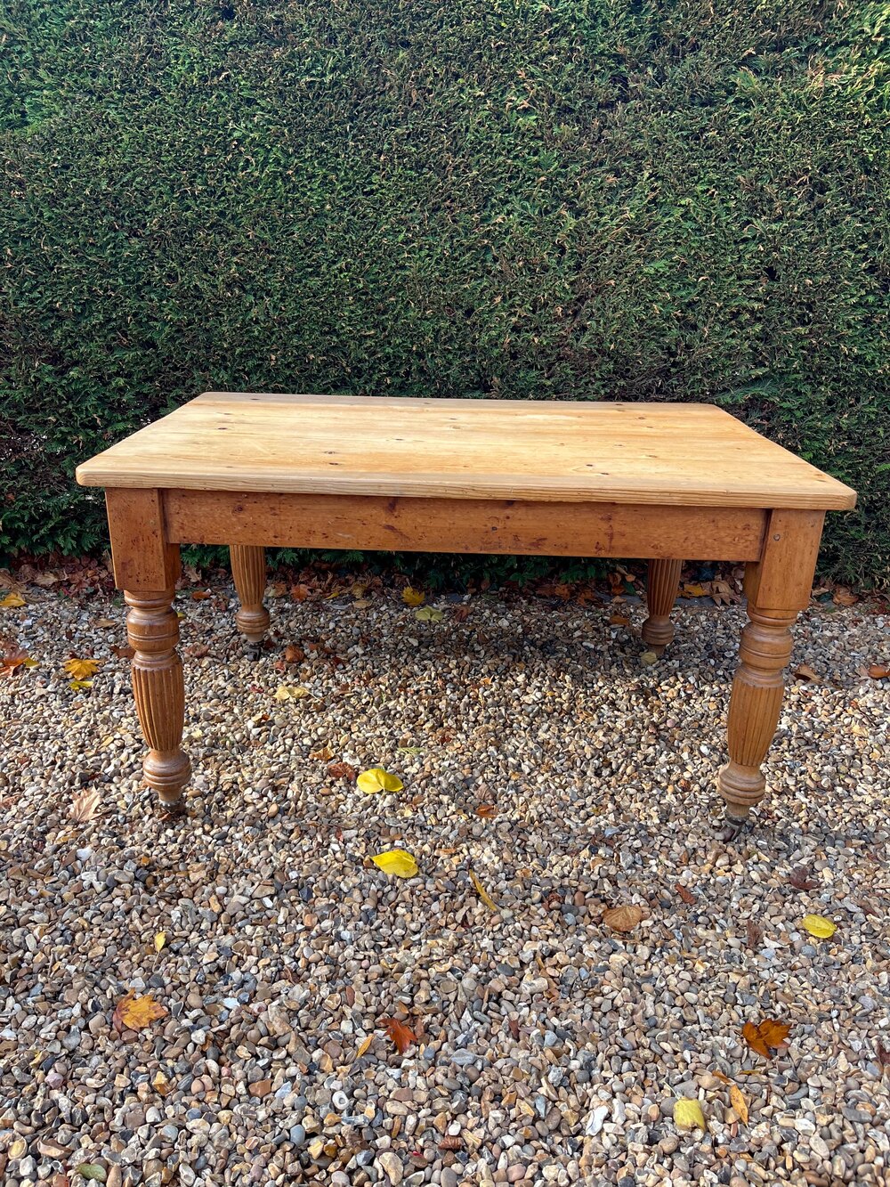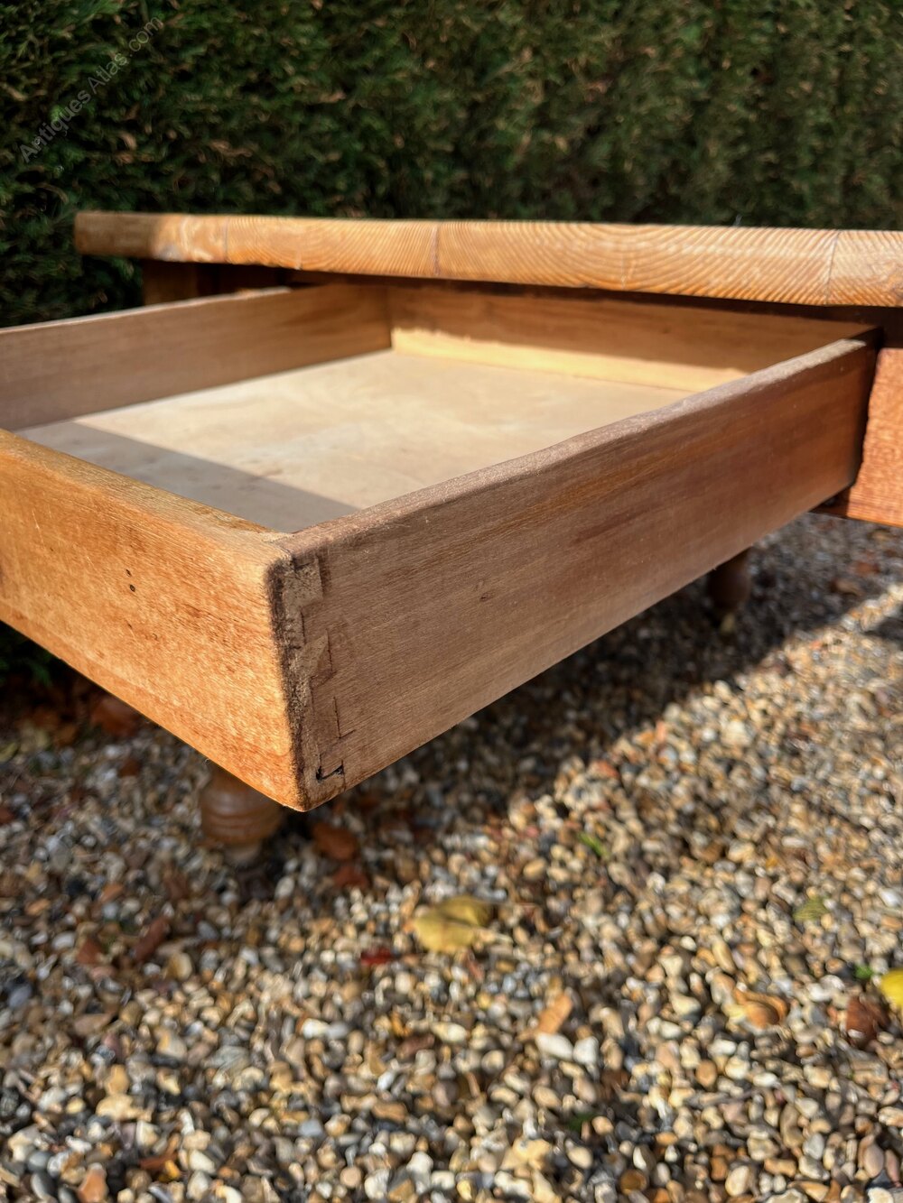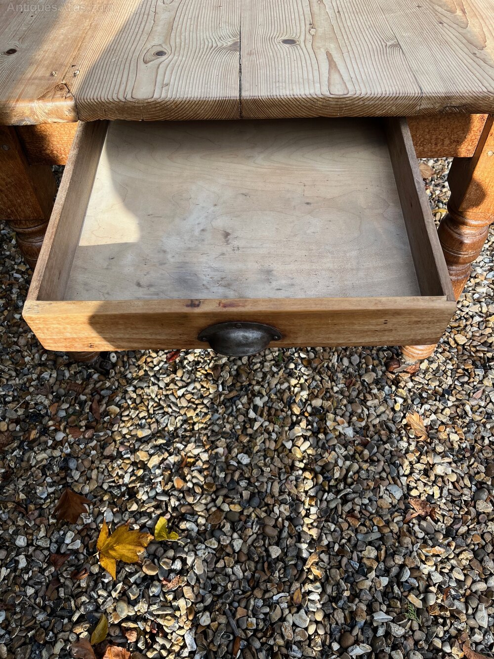 Victorian scrub-top pine farmhouse table with drawer. It has reeded balustrade legs and its original brown porcelain castors. It is 137cm long, 95cm wide and 77cm high. It has marks and wear commensurate with its age and previous use.DateVictorian