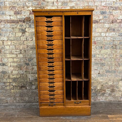 A fantastic example of early commercial furniture, this tall and narrow oak filing cabinet was purpose-built for an architectural office around the 1920s. It features a vertical rising tambour door, which would glid from bottom to top to reveal a run of twenty shallow plan drawers paired with deep vertical pigeonholes.Constructed in solid oak, the cabinet has a robust, clean-lined look . The drawers are dovetailed and retain their original brass cardholders, while the pigeonholes are formed from early plywood panels.