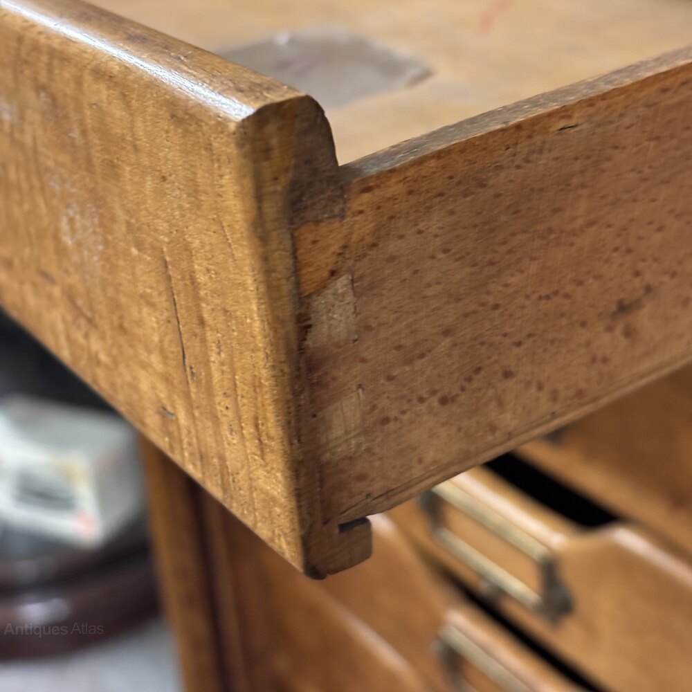 The tambour is made from tightly jointed oak, designed for constant use in a busy design studio. This rising tambour style was perfect for protecting drawings and tracings without needing extra space for a swing door.