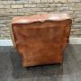 A classic pair of 1940s vintage French club chairs, upholstered in warm, vegetable-dyed tan leather with a beautifully aged patina. These chairs feature the classic scroll-front arms, deep seats, and hand-applied stud detailing to the rear.Comfortable and full of character, the leather shows attractive signs of age and use, including surface creasing, wear to the arms, and some light seam separation, all consistent with their authentic vintage condition. The frames remain solid and supportive, offering both style and substance.