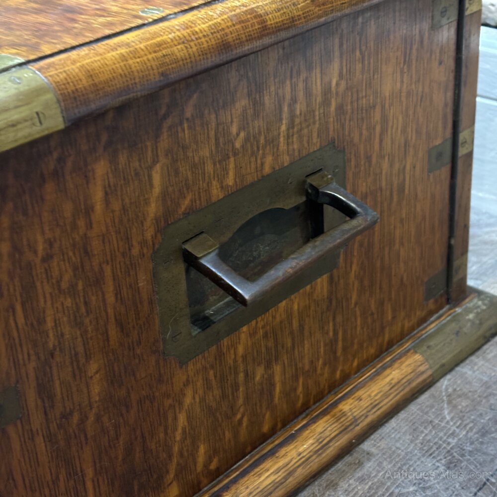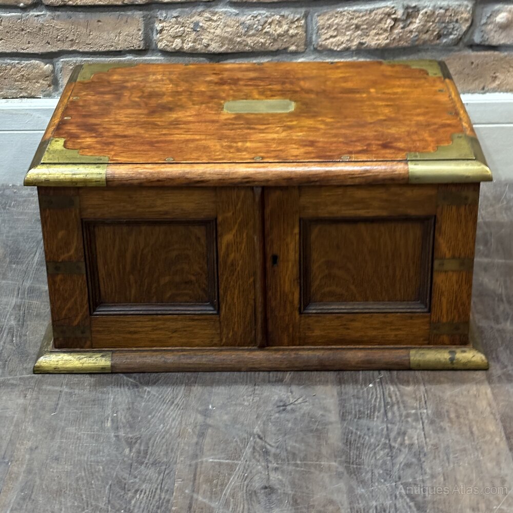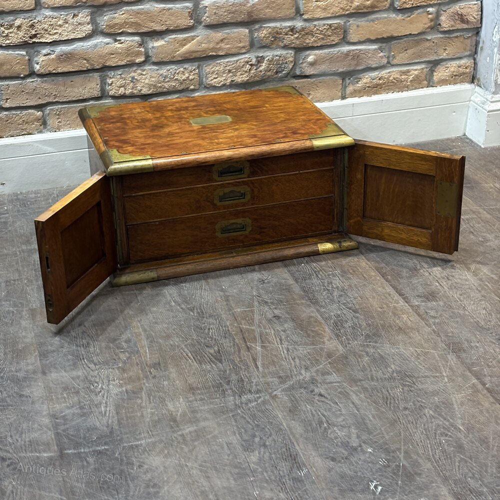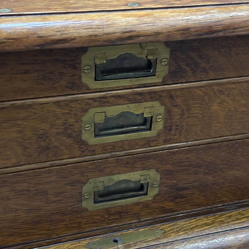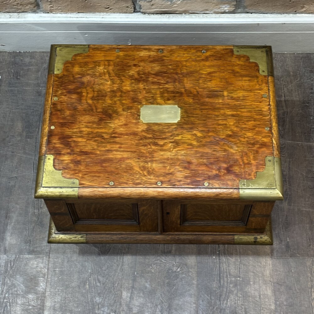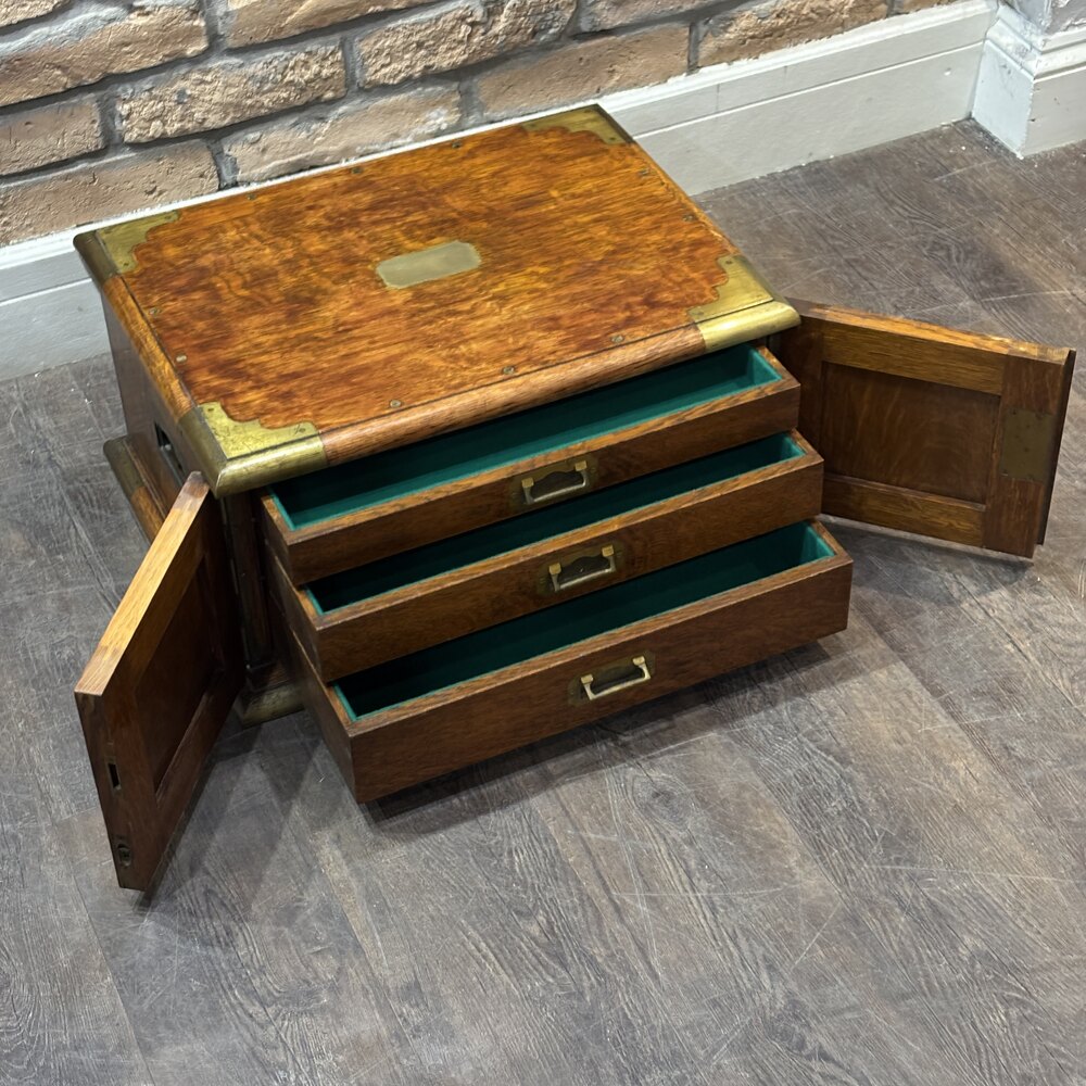 A finely crafted early 20th century , likely made in Britain around 1920s, originally intended for use by a jeweller or watchmaker. Compact and portable in form, this chest is built in the campaign style, with robust brass corner strapping and flush-mounted campaign handles.The front panel doors open to reveal three shallow internal drawers, each lined in a rich green fabric ideal for storing and protecting delicate items such as jewellery, watches, or precision tools. The top is fitted with a central blank brass plaque, suitable for engraving, and features beautiful oak grain with a warm patina.