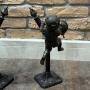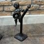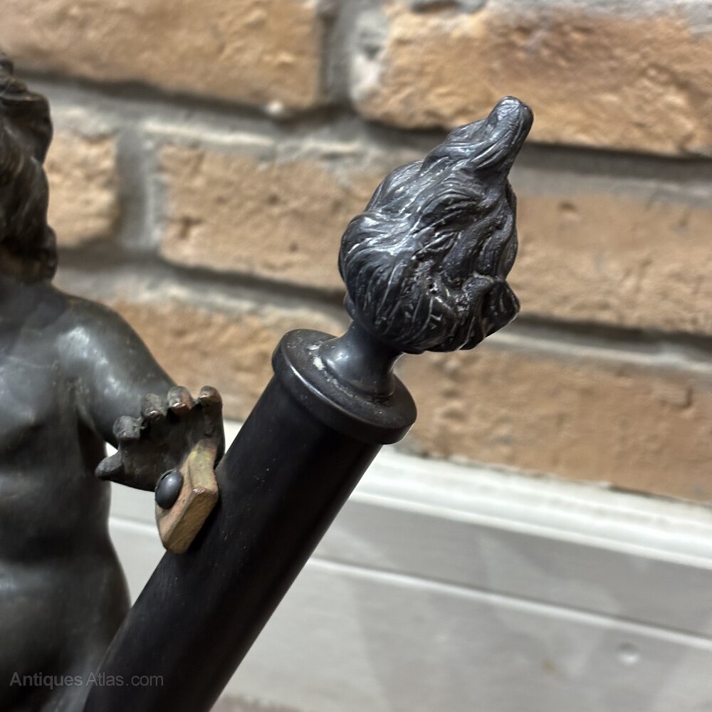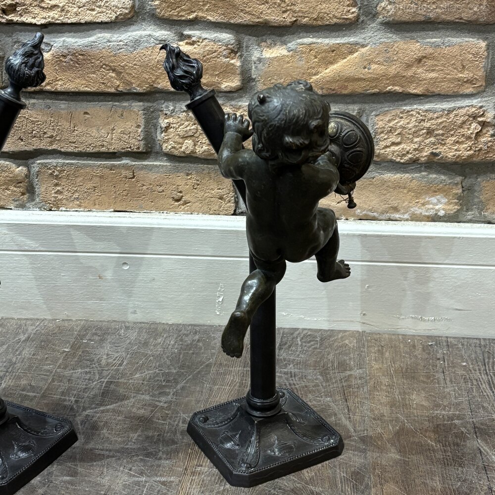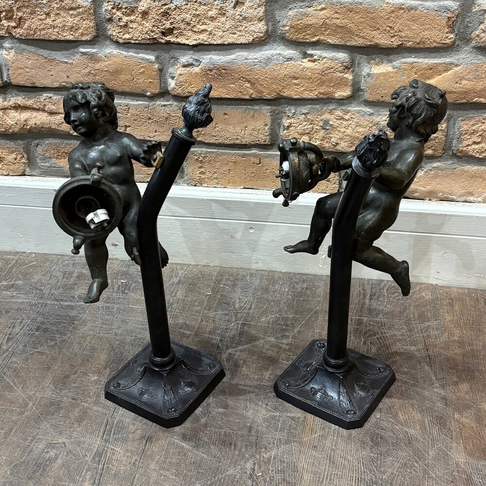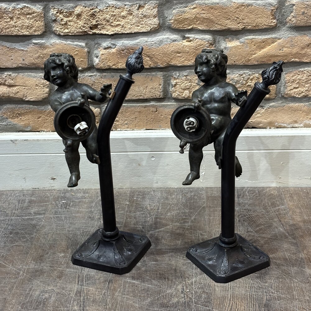 A pair of early 20th-century French figural lamps, featuring beautifully cast metal cherubs clinging to torch-style sconces. The cherub figures, ornate bases, and flame finials are all original, showing lovely detailing and patination consistent with their age.The angled poles have likely been replaced during a later restoration, finished in matte black to complement the original components. Each cherub holds a decorative sconce with remnants of original fittings, making them excellent candidates for rewiring.