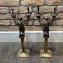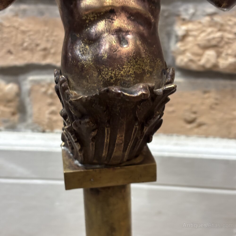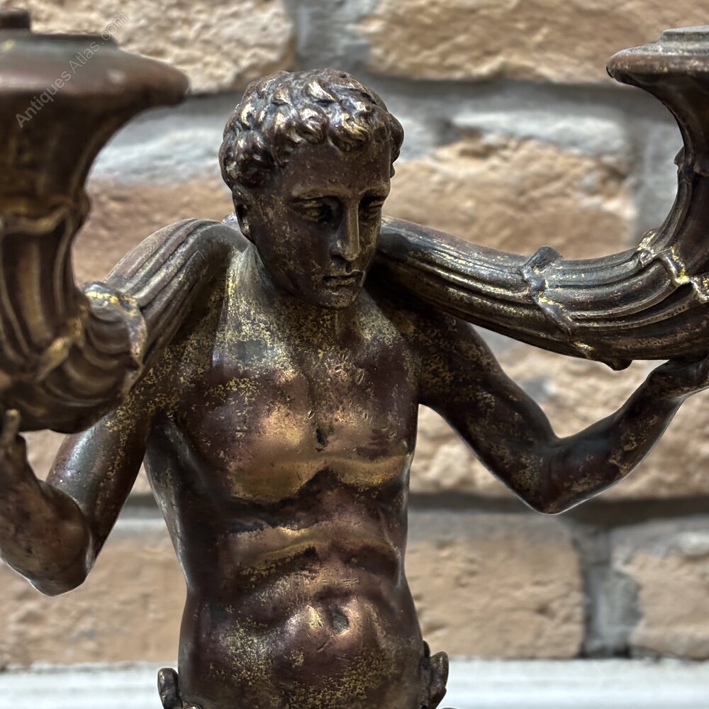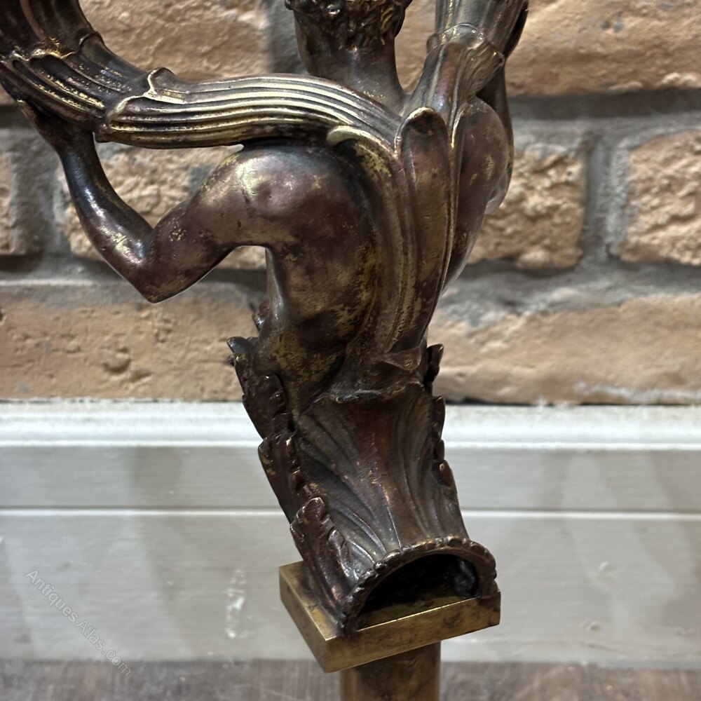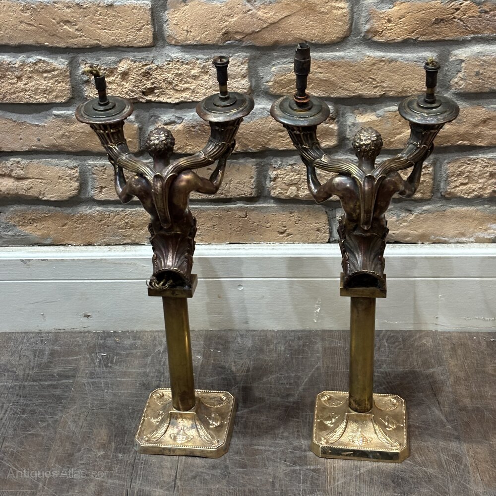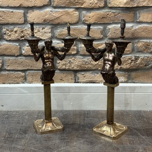 A striking pair of sculptural twin-arm lamps featuring cast merman figures, each emerging from stylised bases set on square plinths and supporting fluted light arms. These pieces were originally conceived as candle candelabra, and were adapted for use as electric lighting in the early 20th century.The figures are boldly modelled, with expressive facial features and classical detailing, finished in a dark patinated bronze surface. The later electrification allows the pieces to function practically while retaining their dramatic sculptural presence.