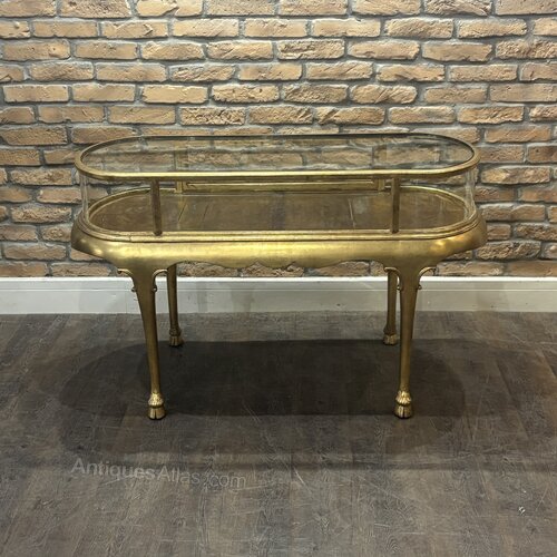 An original petite early 20th-century shop display counter, constructed using a combination of solid oak, mahogany, and pitch pine.The counter features a shaped moulded base supporting a bow-ended display case, framed in brass-toned wood and fitted with a discreet hinged access panel to the rear. The slender legs terminate in decorative feet, adding neoclassical note to the overall design.