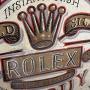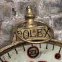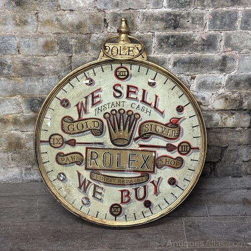A striking mid-20th-century painted shop sign, dating to the 1950s, designed in the distinctive form of a pocket watch.The circular dial is hand-painted with Roman numerals and minute markers, centred with bold lettering reading “We Sell / We Buy – Rolex – Gold / Silver – Pawn Shop – Finest Repairs”, and finished with a crown motif. The upper finial and hanging ring further reinforce the pocket-watch silhouette, giving the piece both depth and strong graphic presence.