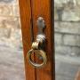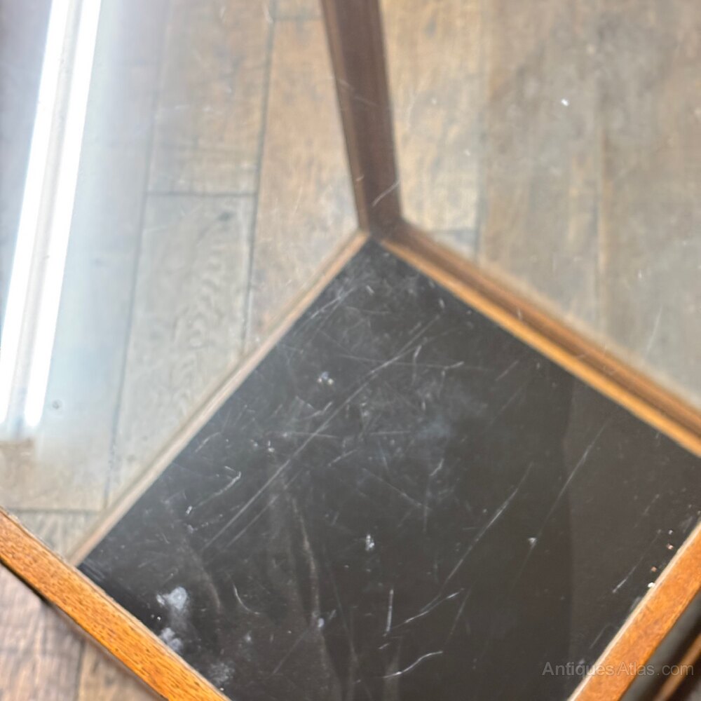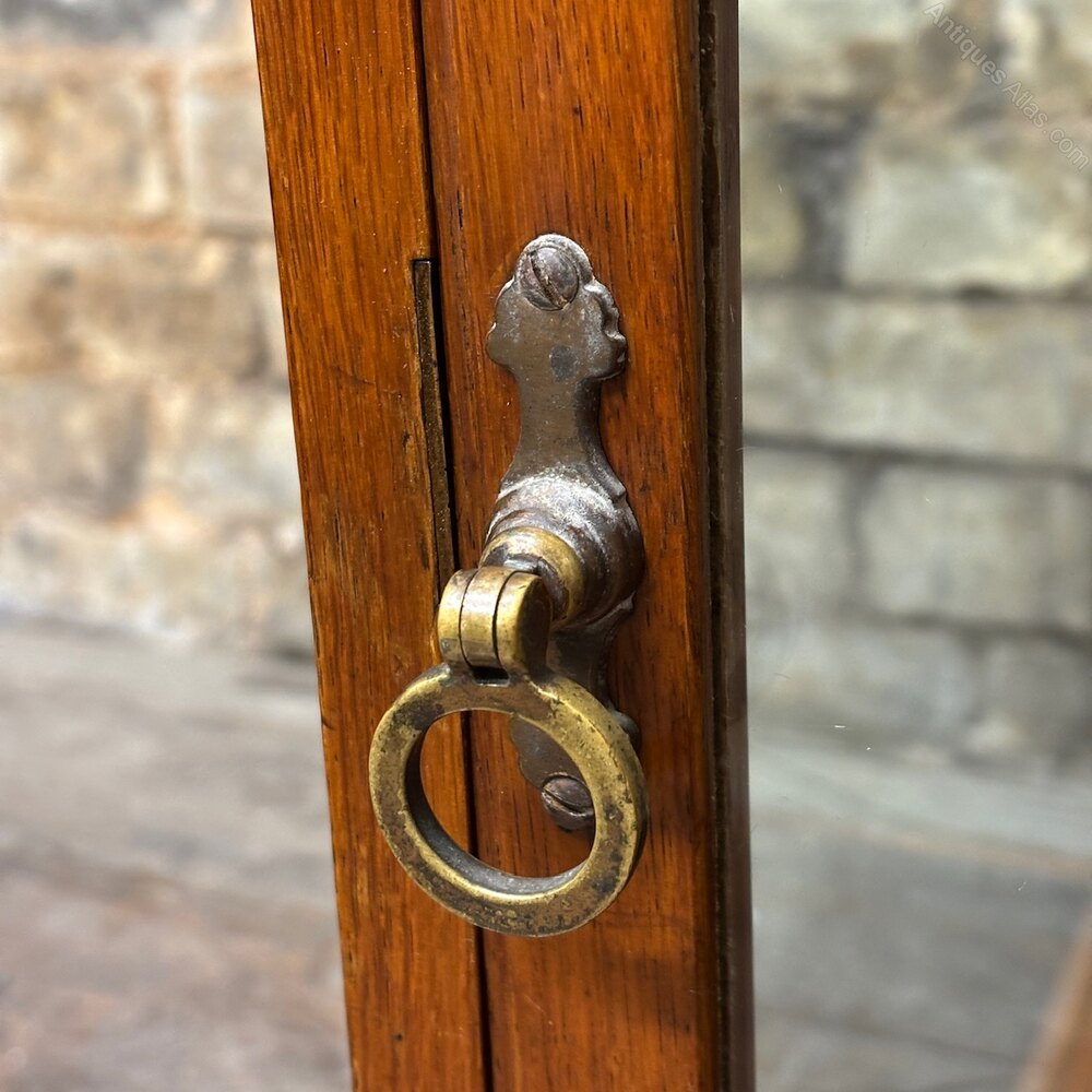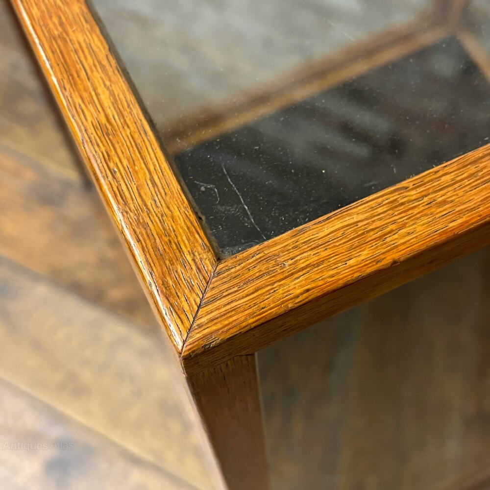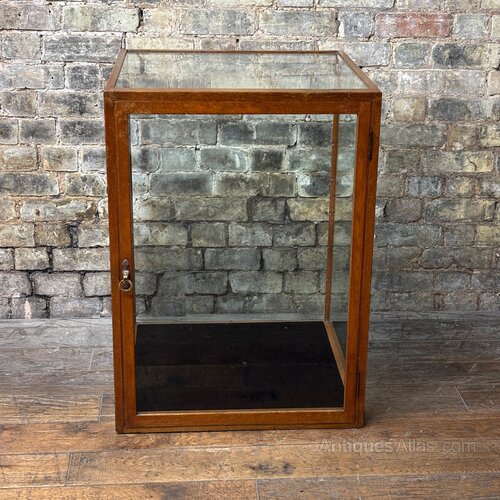 A classic and excellent example of early 1920s shopfitting, this countertop display cabinet is made from solid oak with a warm, rich tone and has been polished to highlight the natural grain of the wood. It is fitted with large glass panels to the front, sides, and top, allowing the contents inside to be viewed clearly from multiple angles.The single door opens to reveal the interior and retains its original working lock along with a brass ring handle. The interior features a dark display base, creating a strong contrast with the surrounding glass and making it ideal for presenting jewellery, small collectibles, or other retail merchandise.