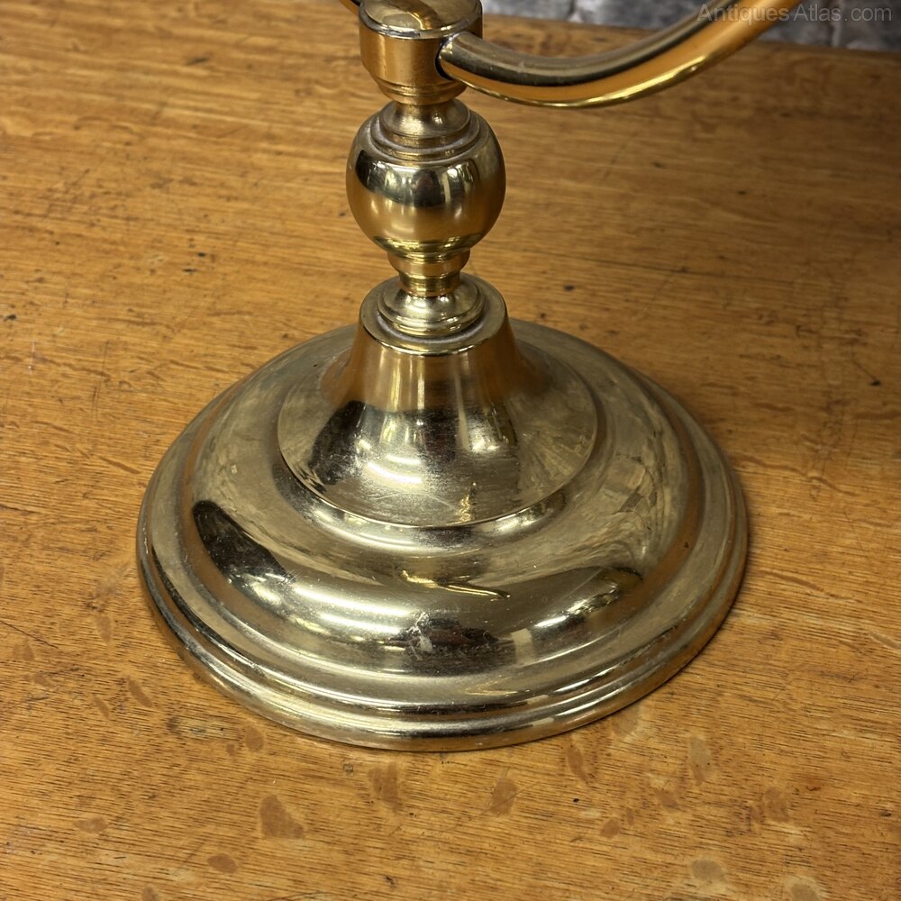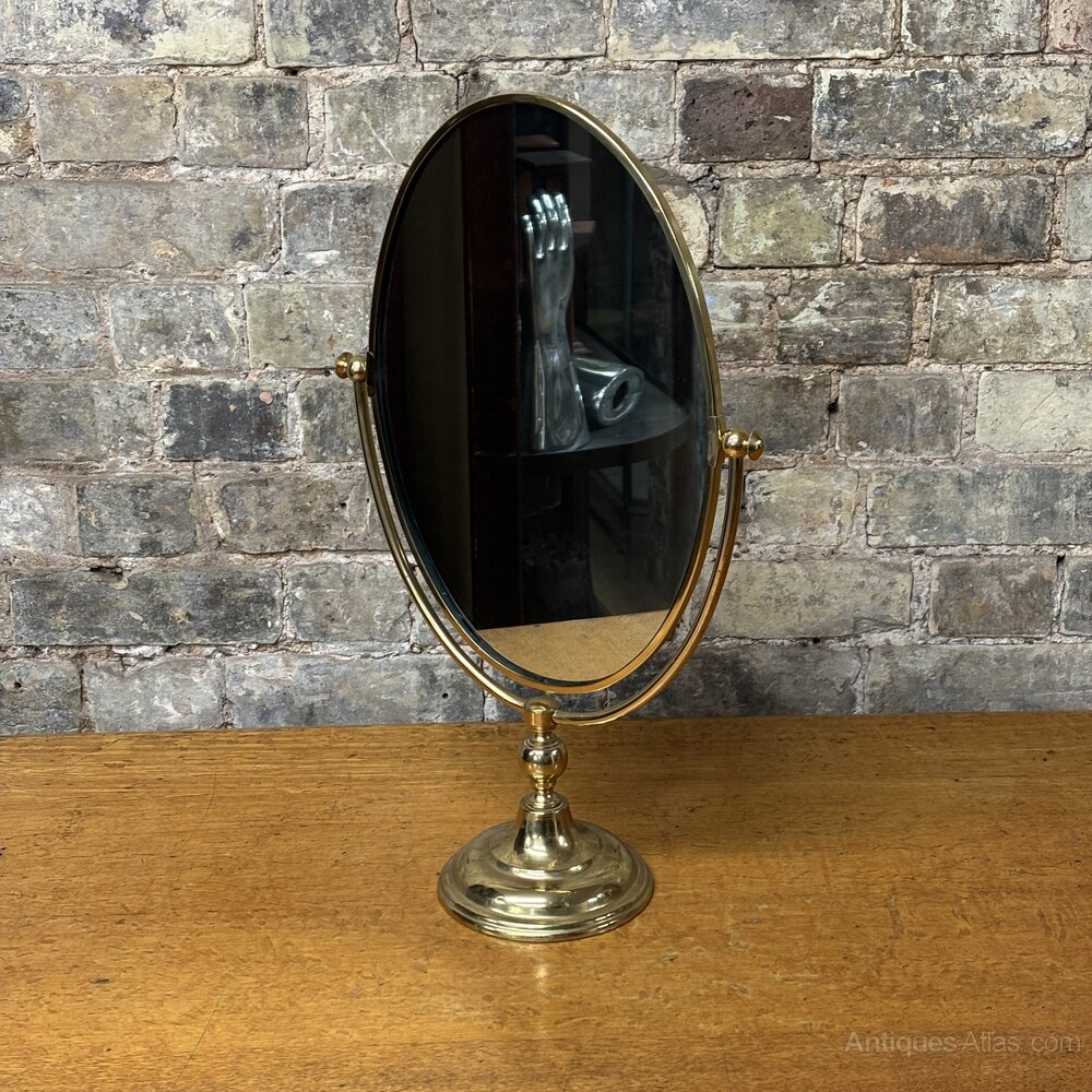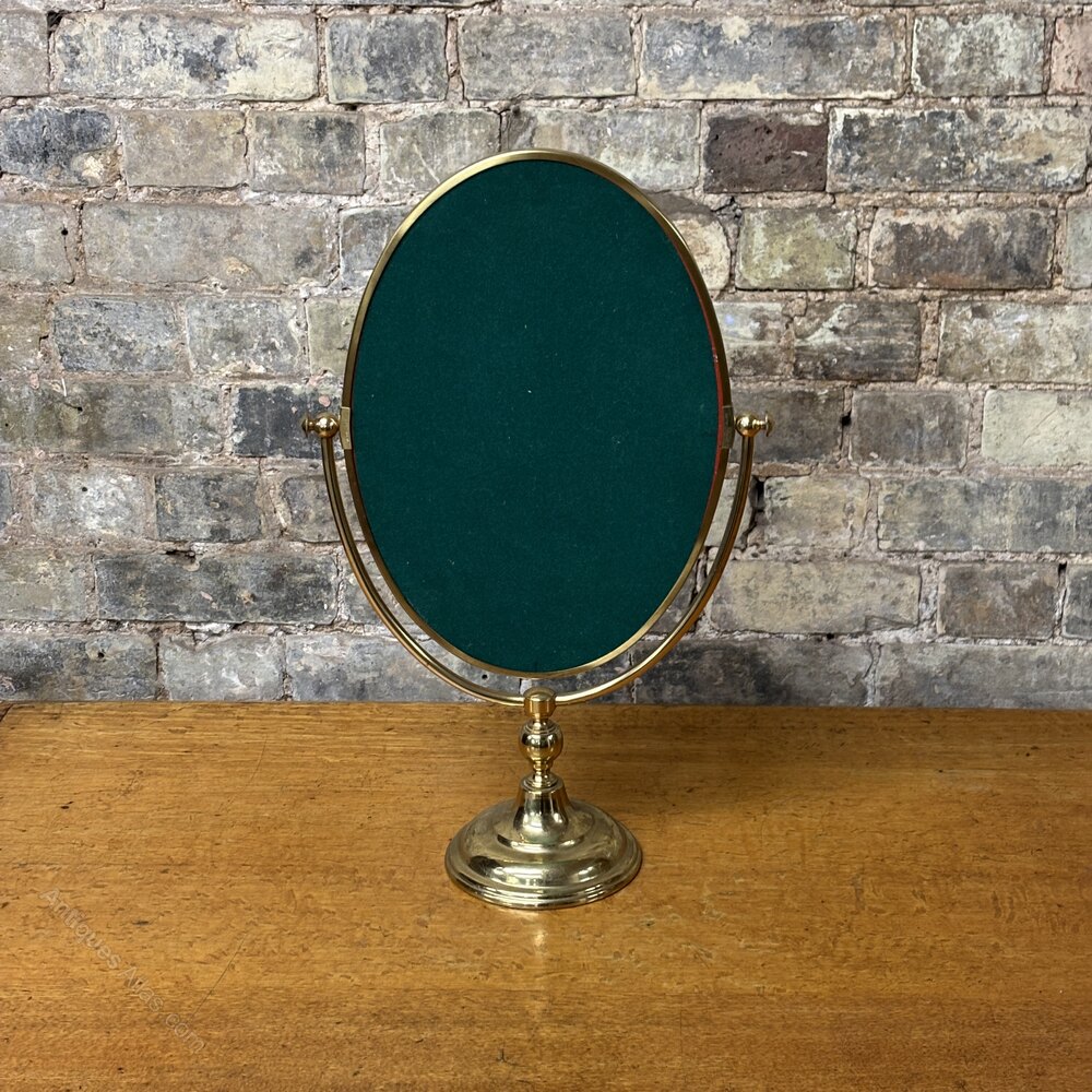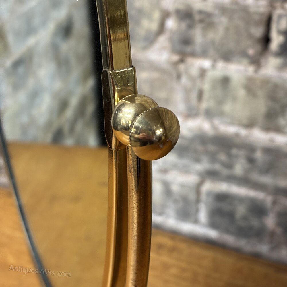A smart mid-20th century dressing table mirror by Peerage England, dating to around the 1950s.The mirror is set within a solid brass oval frame and supported on a slender central column with a weighted circular brass base, giving it a nice stable feel on a dressing table or vanity. The mirror tilts using the original side adjustment knobs, allowing it to be positioned at different angles.