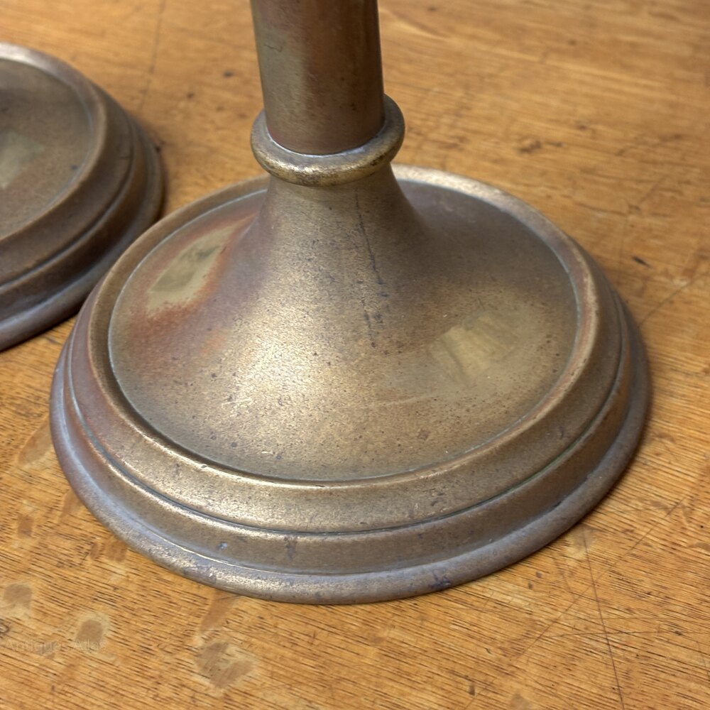 Here we have a pair of early 20th century brass table lamps designed in the form of traditional candlesticks. Each stands on a stepped circular base with a simple column stem and retains a drip tray detail beneath the lamp holder, referencing classic candle forms.The brass has developed a rich, aged patina over time, with subtle tonal variation across the surface. The design is clean and understated, making the pair easy to place in both traditional and more contemporary interiors.