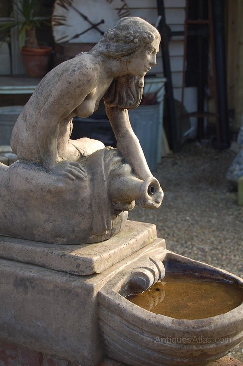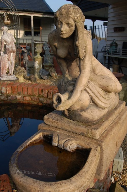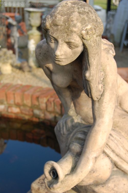 An English Composition Stone Fountain after a 19thC. stoneware original by Shaw and Leaver.Art Deco style, the recumbent lady with jug pouring water into a demi-lune scalloped bowl.