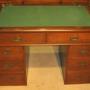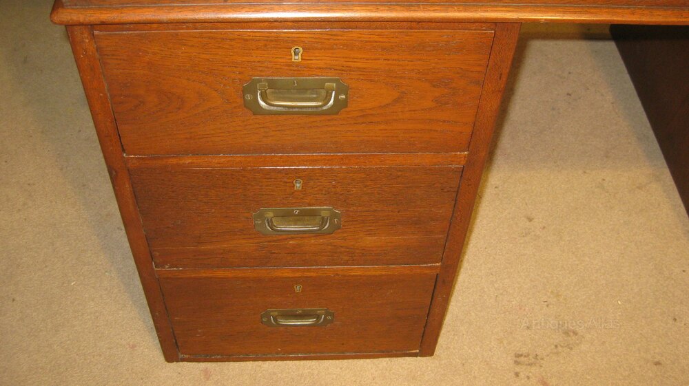 Late Victorian solid teak pedestal campaign desk. The 8 drawers of a good hand cut dovetailed construction with sunken brass handles and working locks. Currently with a green baize writing surface but could be leathered to suit.Size 48 x 30 x 30 inches tall (122 x 76 x 77 cm tall)