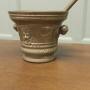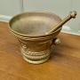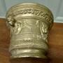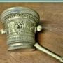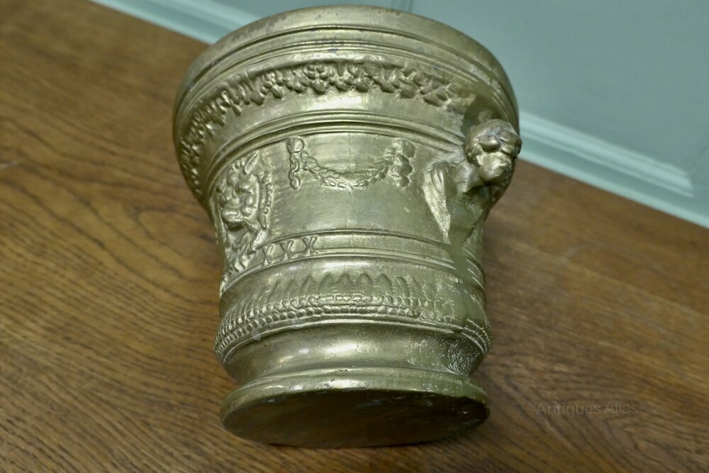 Large Heavy Brass Gothic Pestle and MortarAn unusual pair and very heavy probably made for the preparation of herbal treatments rather than for culinary use The mortar is clean inside so it could be used in your kitchen, this is a very heavy pair, the outside of the mortar is decorated with the face of the green man and other faces