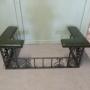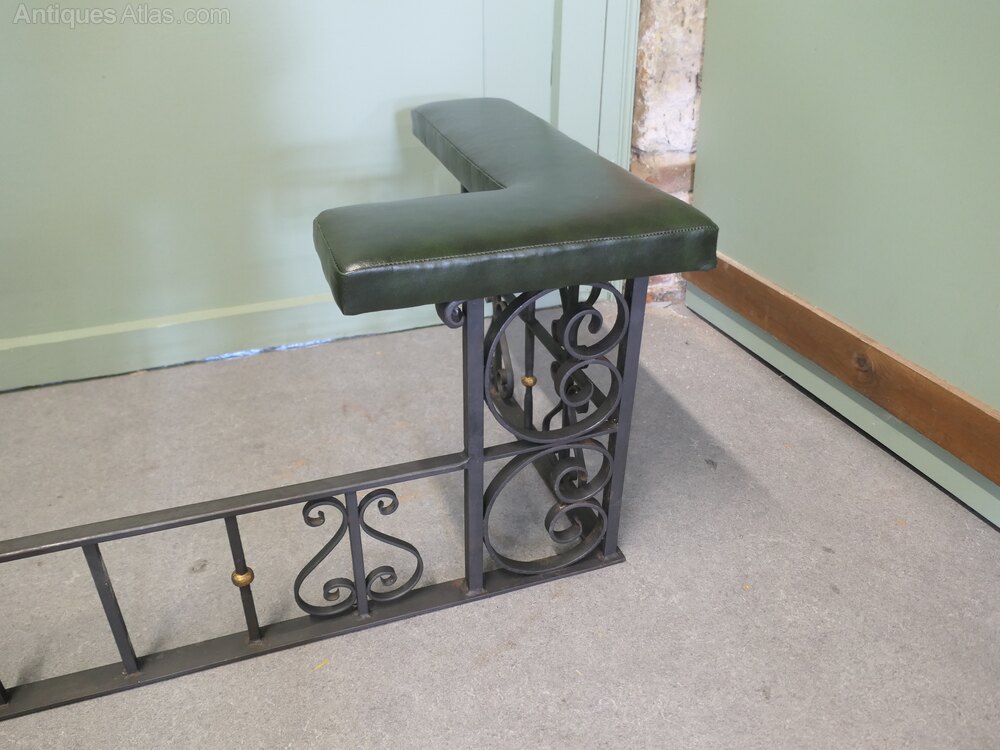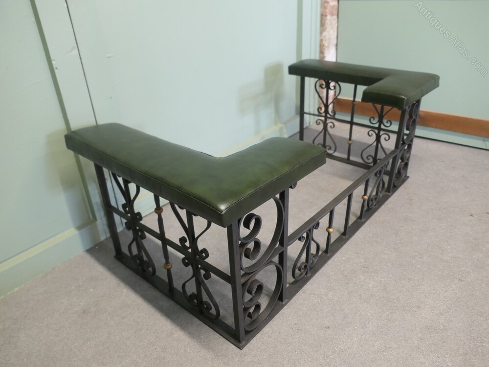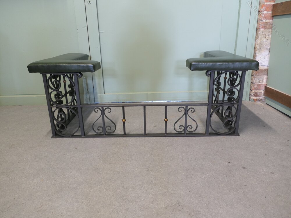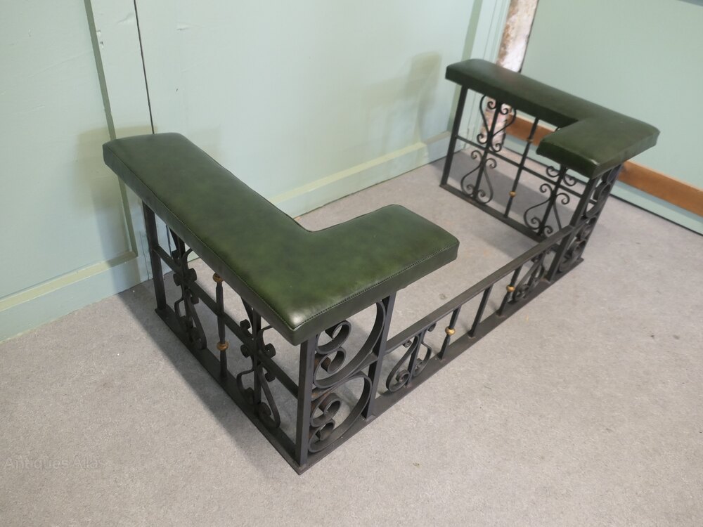 Decorative Wrought Iron and Leather Club FenderThis is an attractive piece of country House Furniture, it is made in wrought iron and has newly upholstered green leather seats