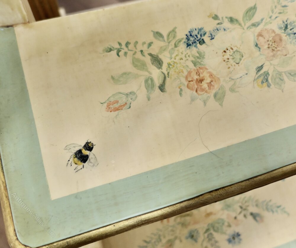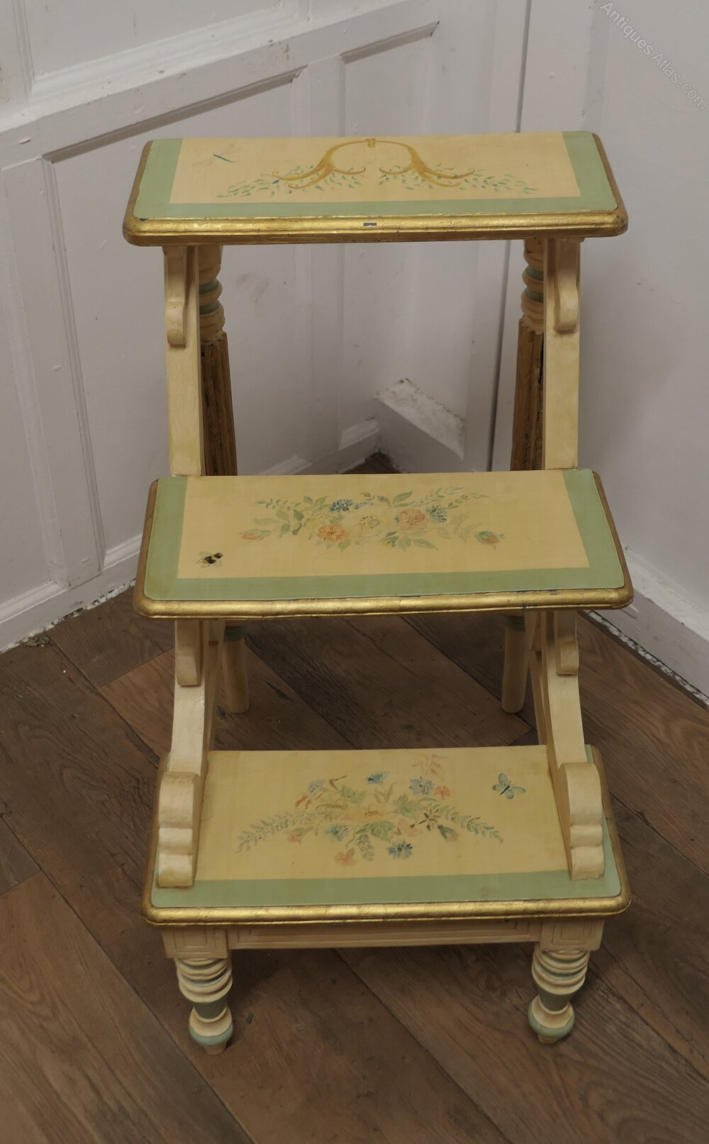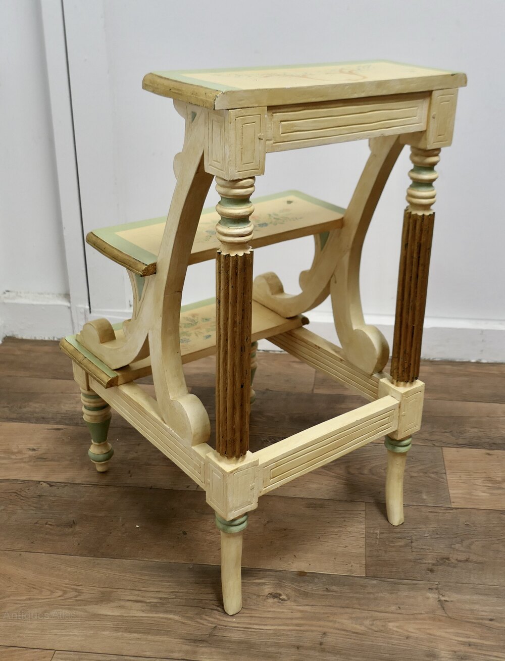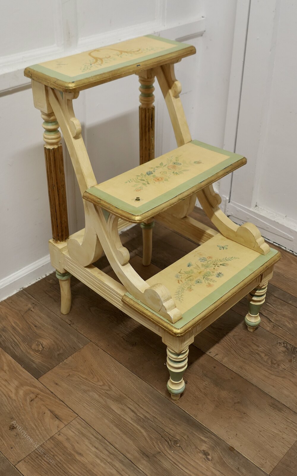 Regency Style Painted Library StepsThis is a sturdy solid piece there are 3 steps, the ladder is painted in the Regency style in Cream, Green and Gold with pretty floral detail with bees and butterflies