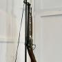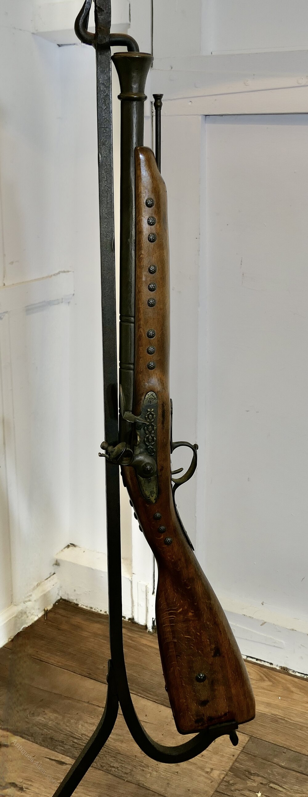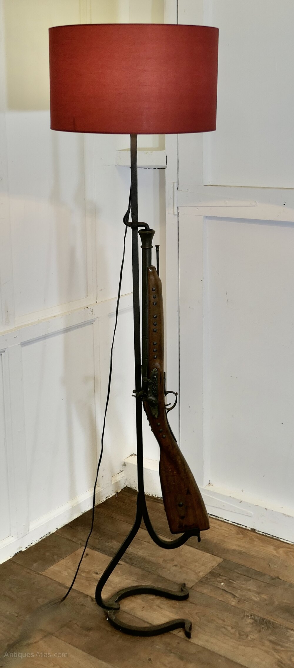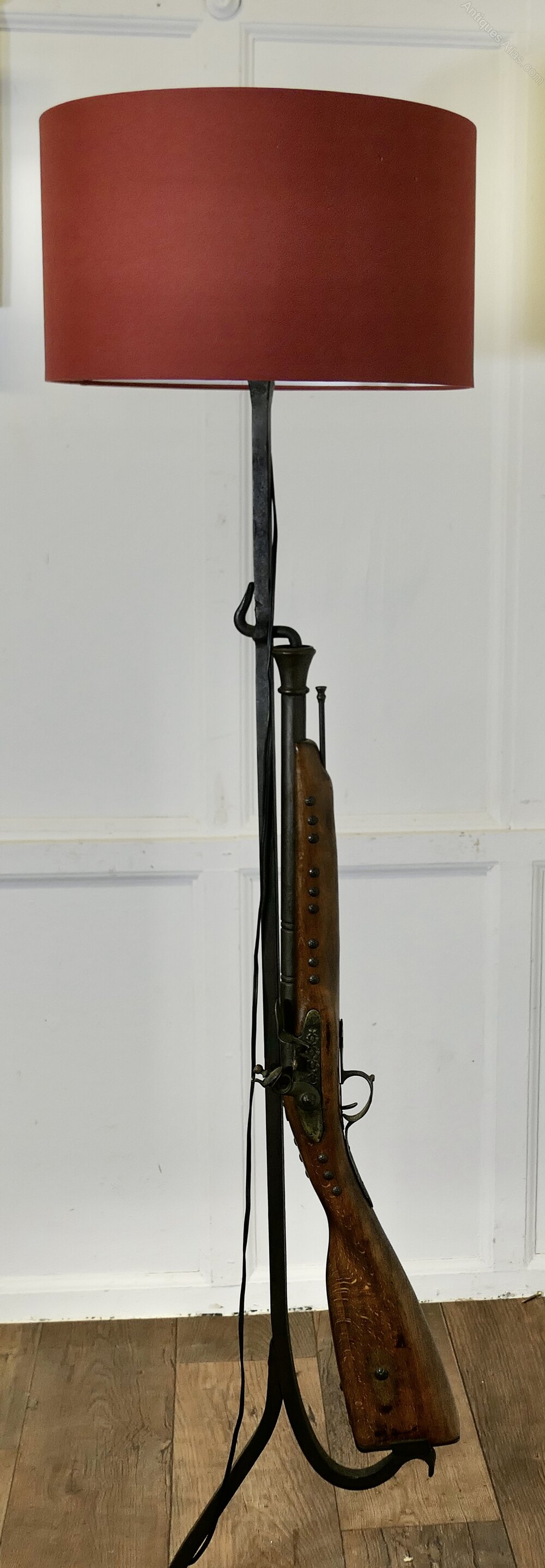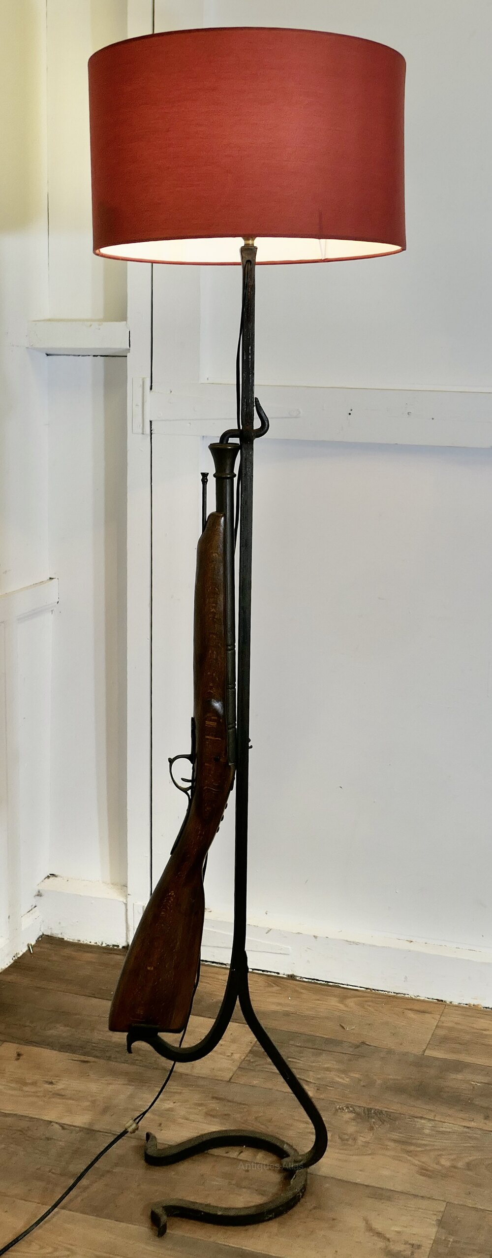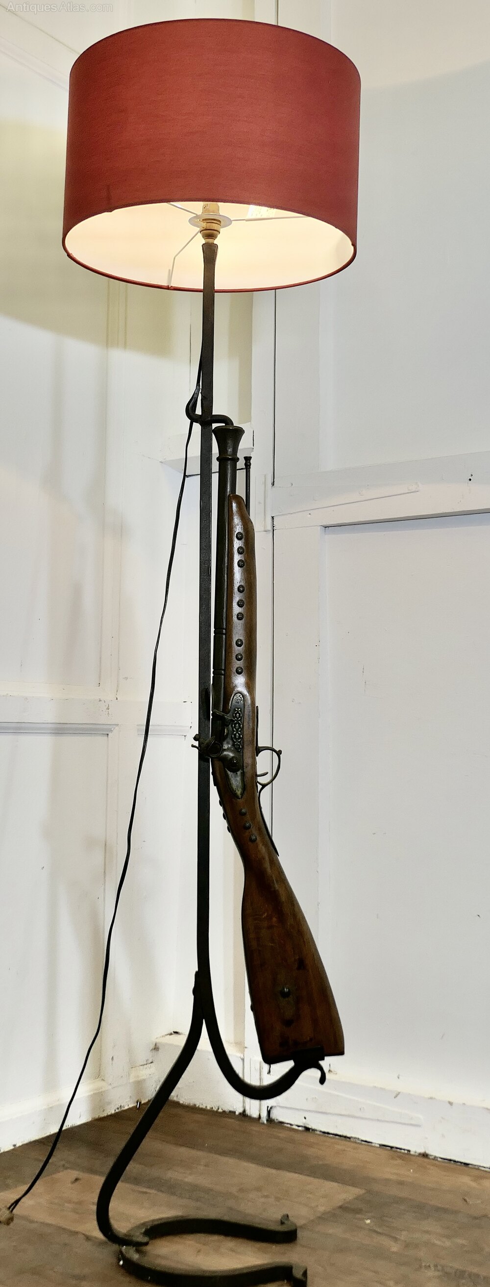 Quirky Hunting Lodge Shooting Rifle LampA great piece made by a blacksmith on a wrought iron stand, it has a Horseshoe shaped base and the upright has a realistic looking imitation Flint Lock Rifle complete with ram rod, needless to say this is not a real gun it is beautifully made and similar to a wall hanging decoration piece, the lamp is working and comes with a burgundy shade