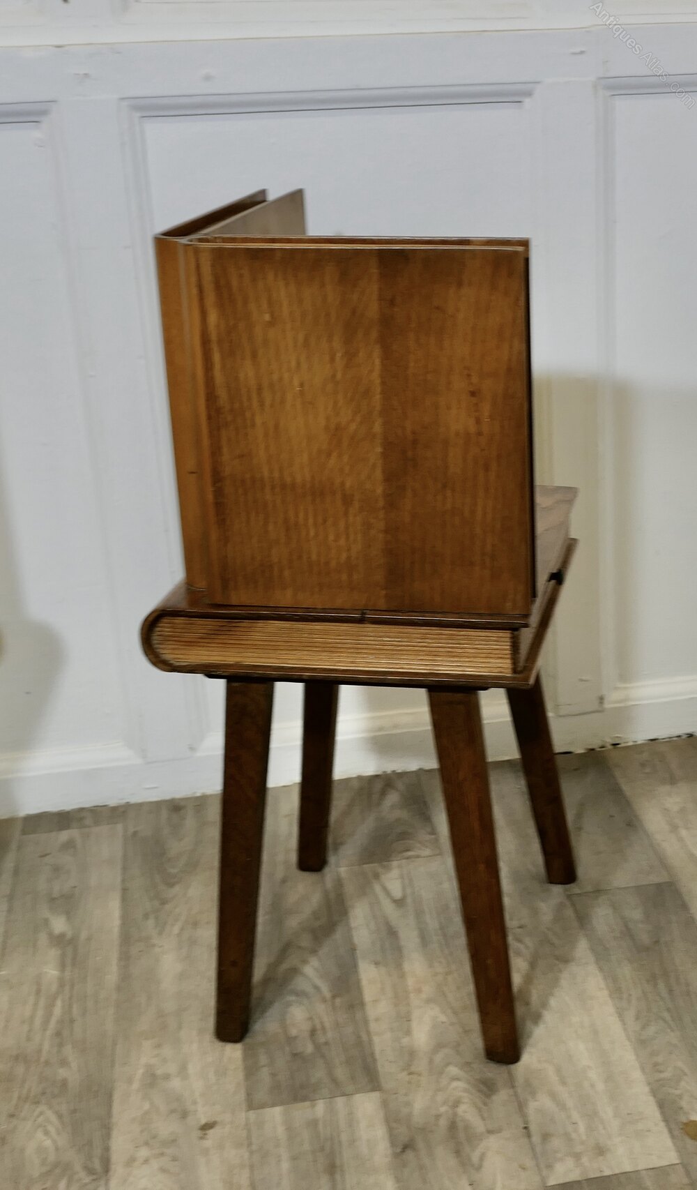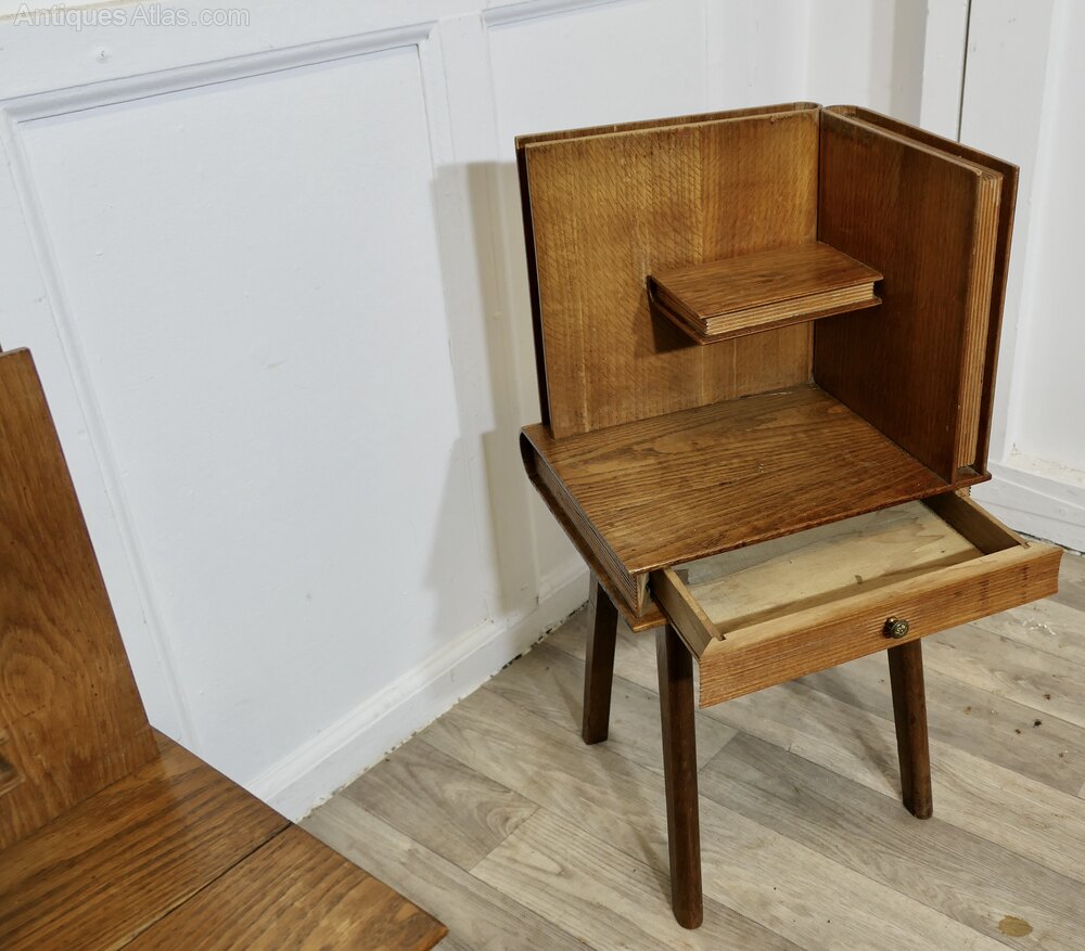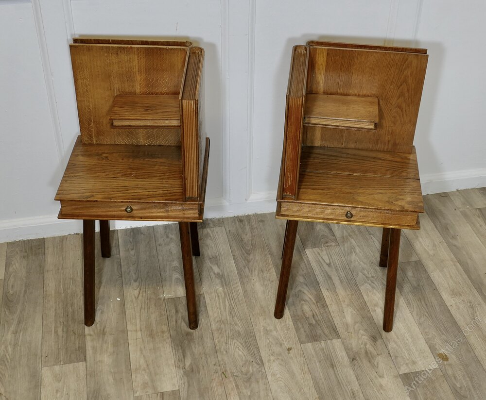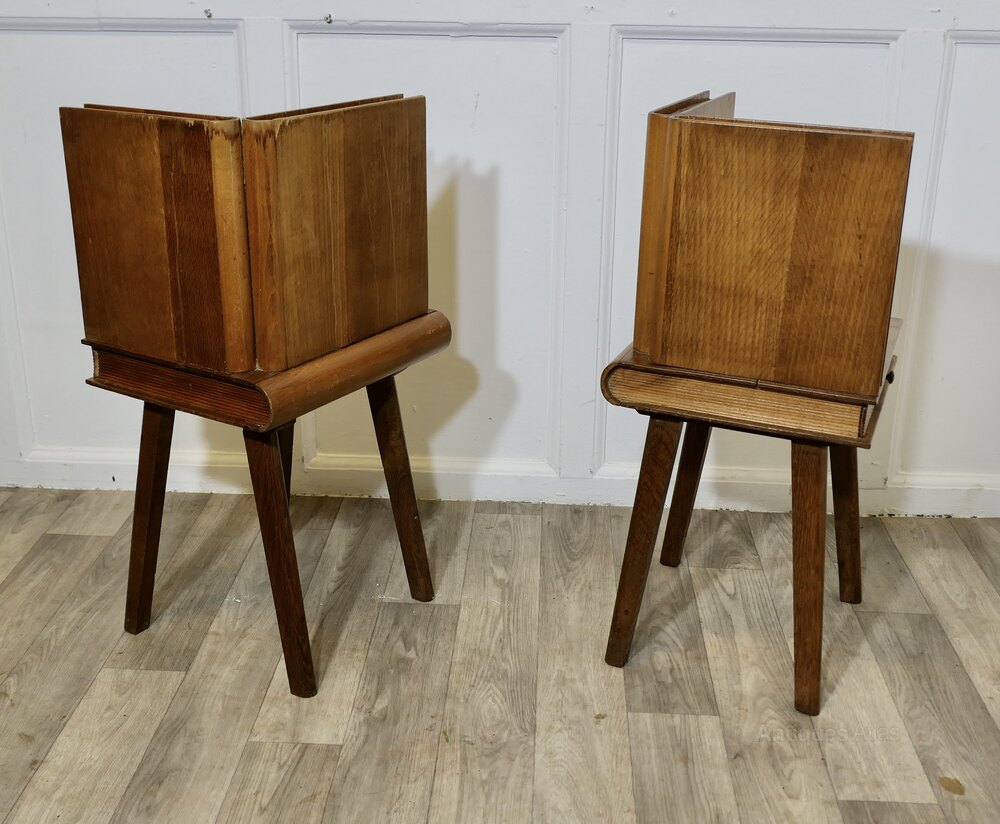 A Pair of French Arts and Crafts Outré Bedside TablesA very attractive pair of cabinets designed to look like they are made from books, they are carved in golden oak, with a small shelf and a drawer and set on straight legs