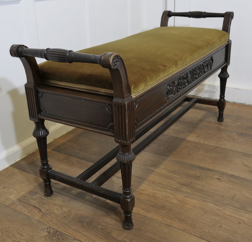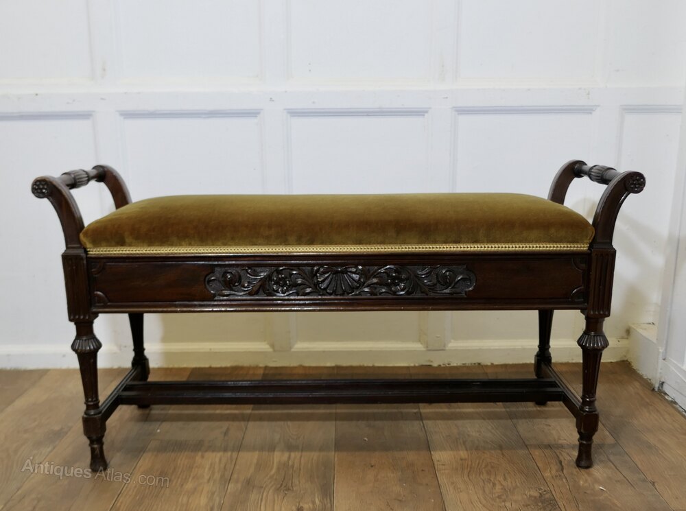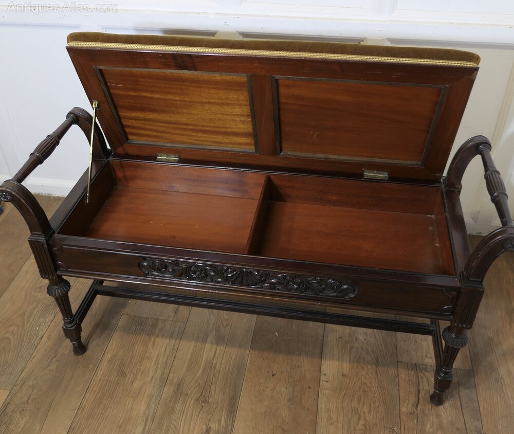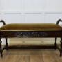 An Edwardian Duet Piano StoolAn original Edwardian duet stool is in very good condition the seat is covered in its origin dark mustard coloured velvet and it has carved apron on both the back and front so looks well from a all sides, the storage compartment inside the seat is divided in 2