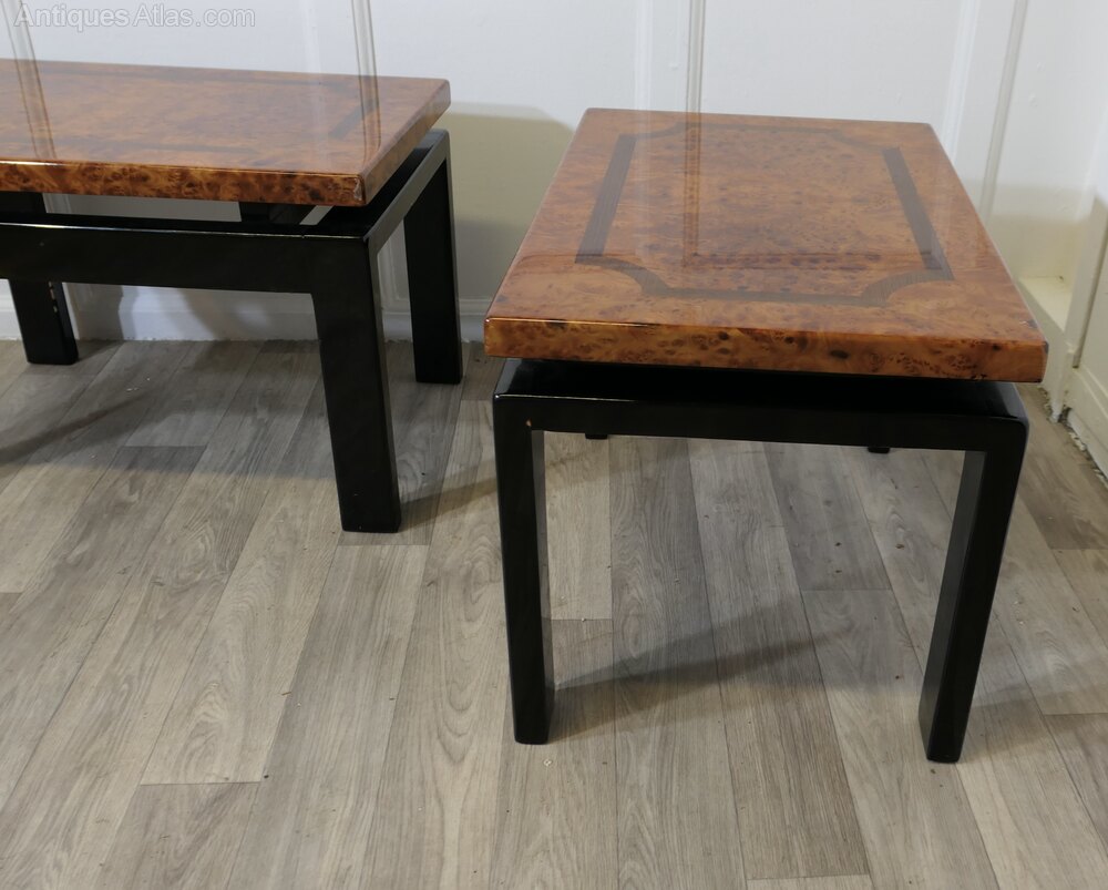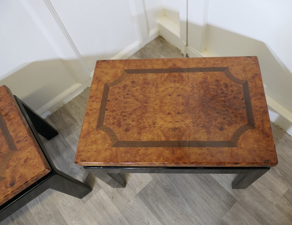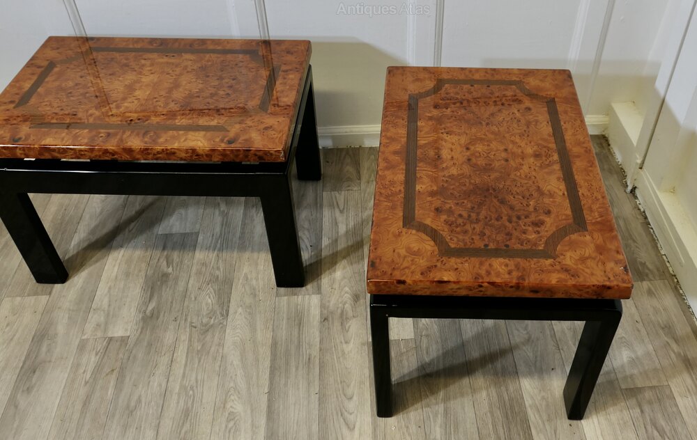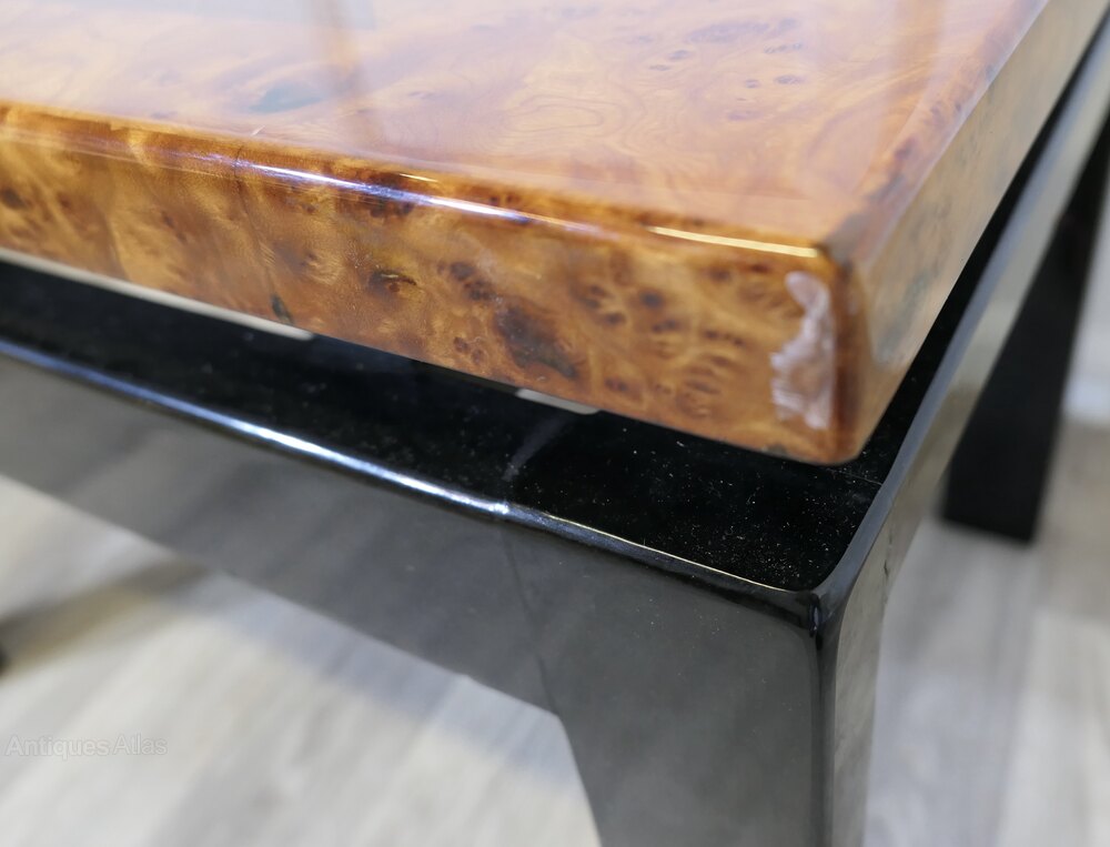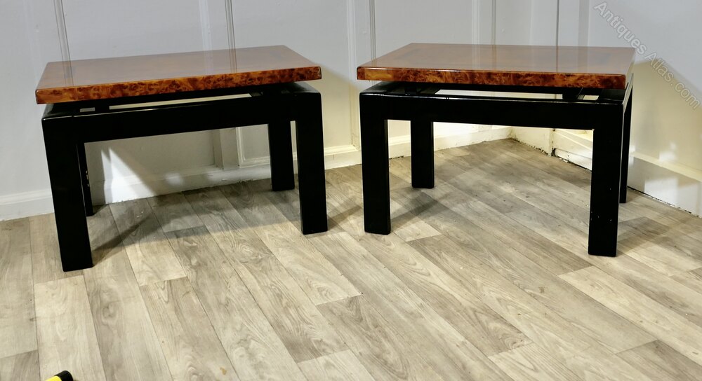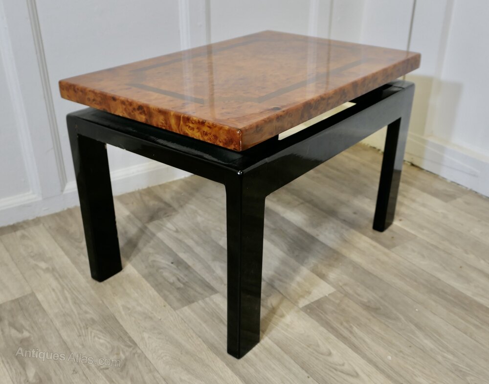 A Super Pair of Art Deco Design Floating Top Low TablesA Pair of Art Deco Style Floating Top Burr Walnut & Black Lacquered Low Tables