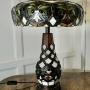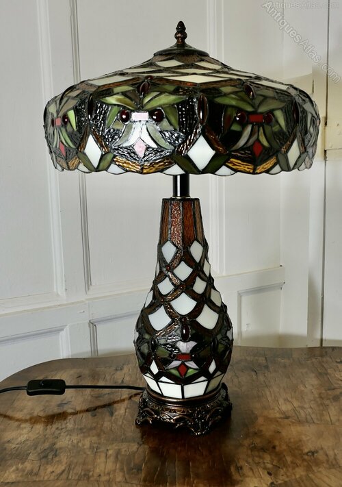 Very Large Tiffany Style Table Lamp with ShadeA very unusual and stunning piece, the lamp and the shade are made in leaded and jewelled glass, the base of the lamp has a lightbulb inside to show the superb design which is repeated in the large shade which has 2 more lightbulbs, as you can imagine this a is magnificent and colourful piece