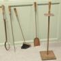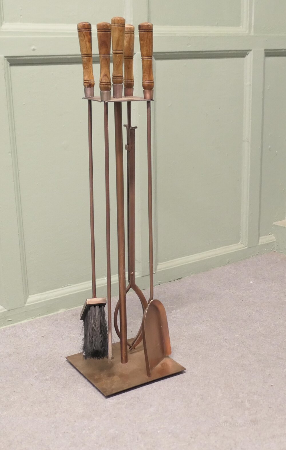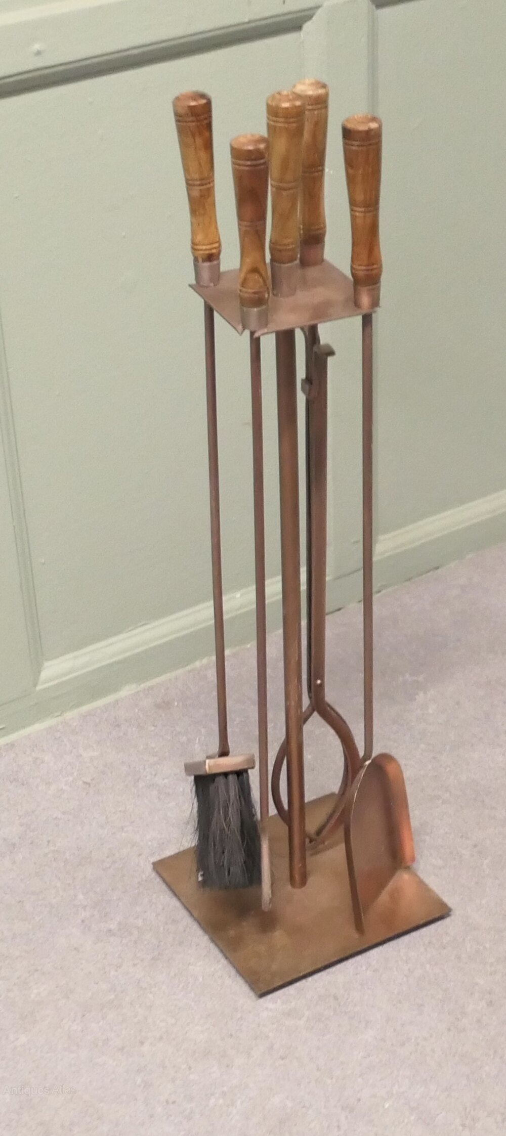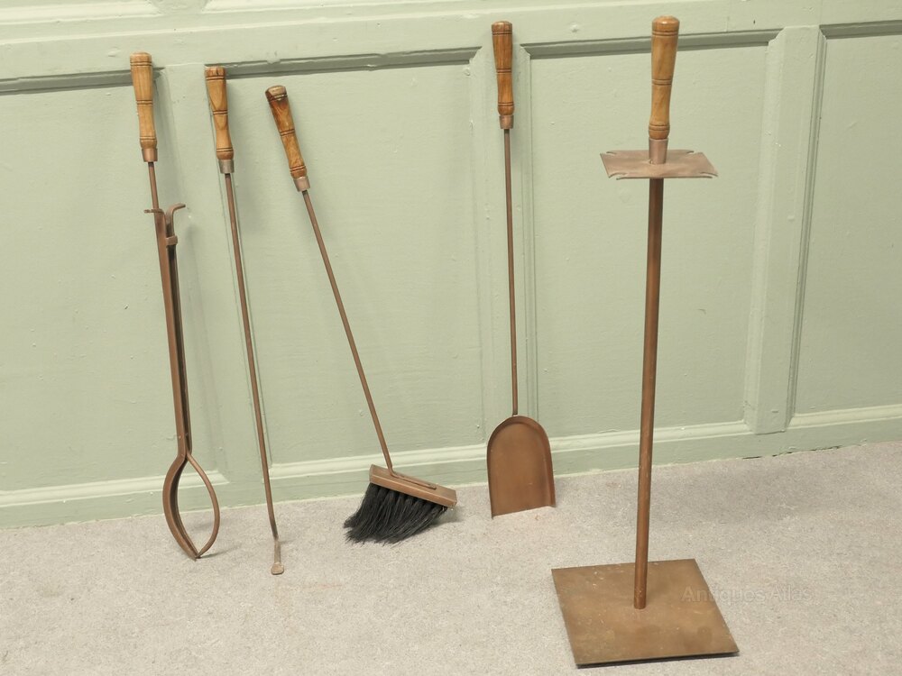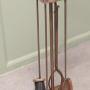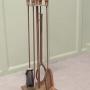Stylish Arts and Crafts Copper Fireside Companion Set, Fireside ToolsThis is a Stylish copper set with turned fruitwood handles on its own very sturdy rectangular stand, shovel, brush tongs and poker