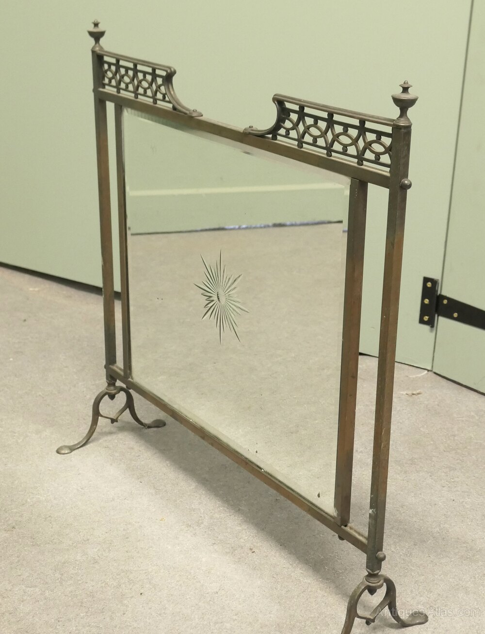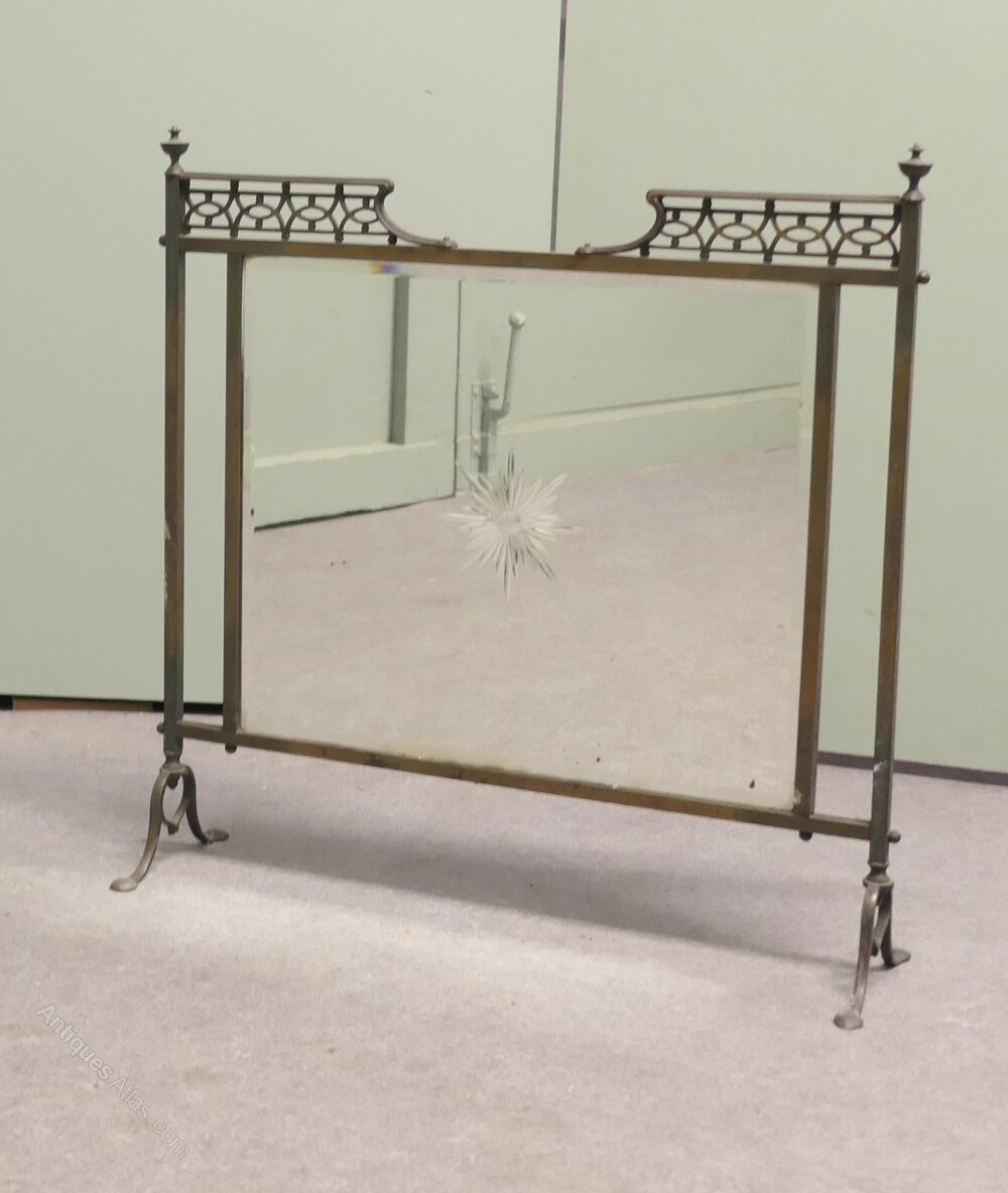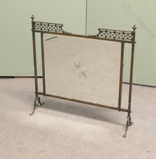 A Victorian Arts and Crafts Brass Mirror Fire Screen with Etched SunburstThis is a very decorative Fire Screen it has a pierced aged brass stand, the Mirror has an etched Starburst in the centre
