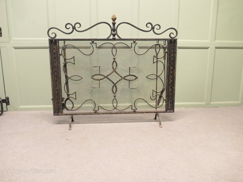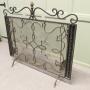 Large Wrought Iron Fire Screen, With Fire IronsThis is a very attractive piece and unusually large, the wrought iron work is curvy with a fine mesh infill backing and on the back there are hooks with Fire irons hanging from them