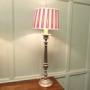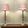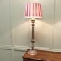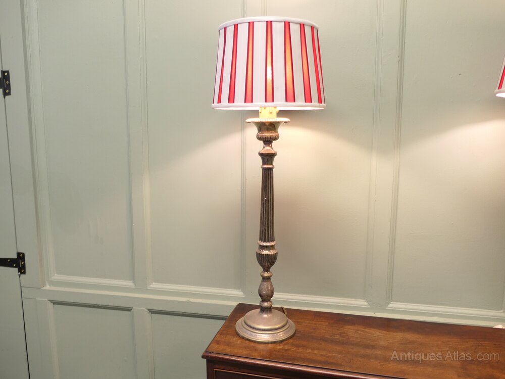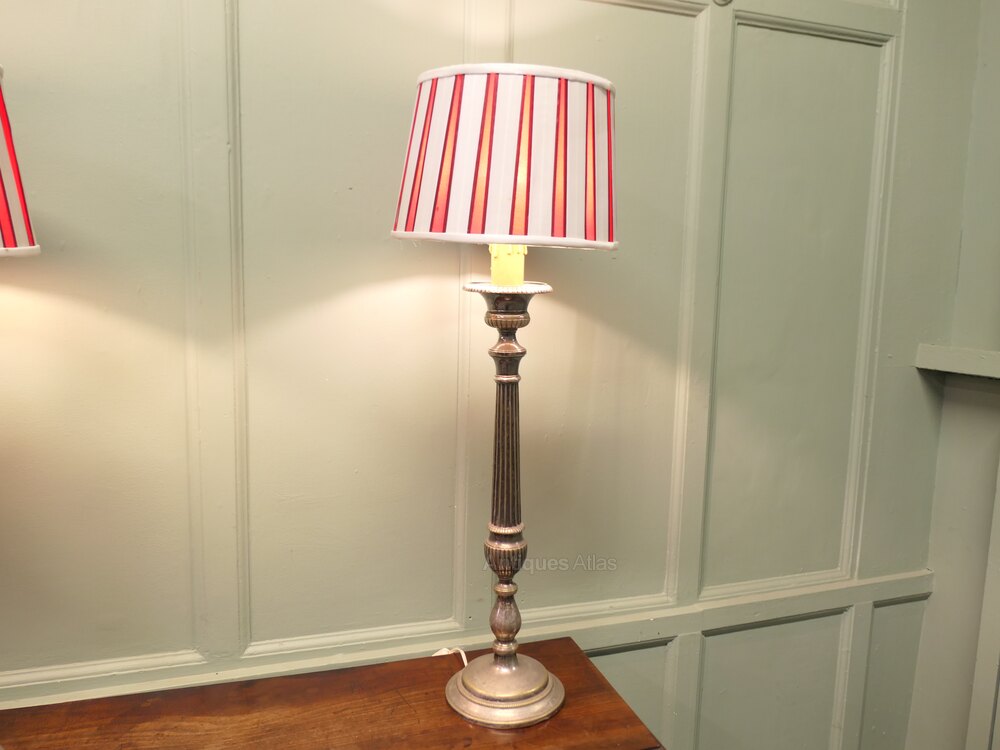 A Pair of Large Silver Plated Table LampsThese lamps are statuesque pieces, silver-plated with a very large sculptured central column, the lamps have been matched with red and white regency style striped shades